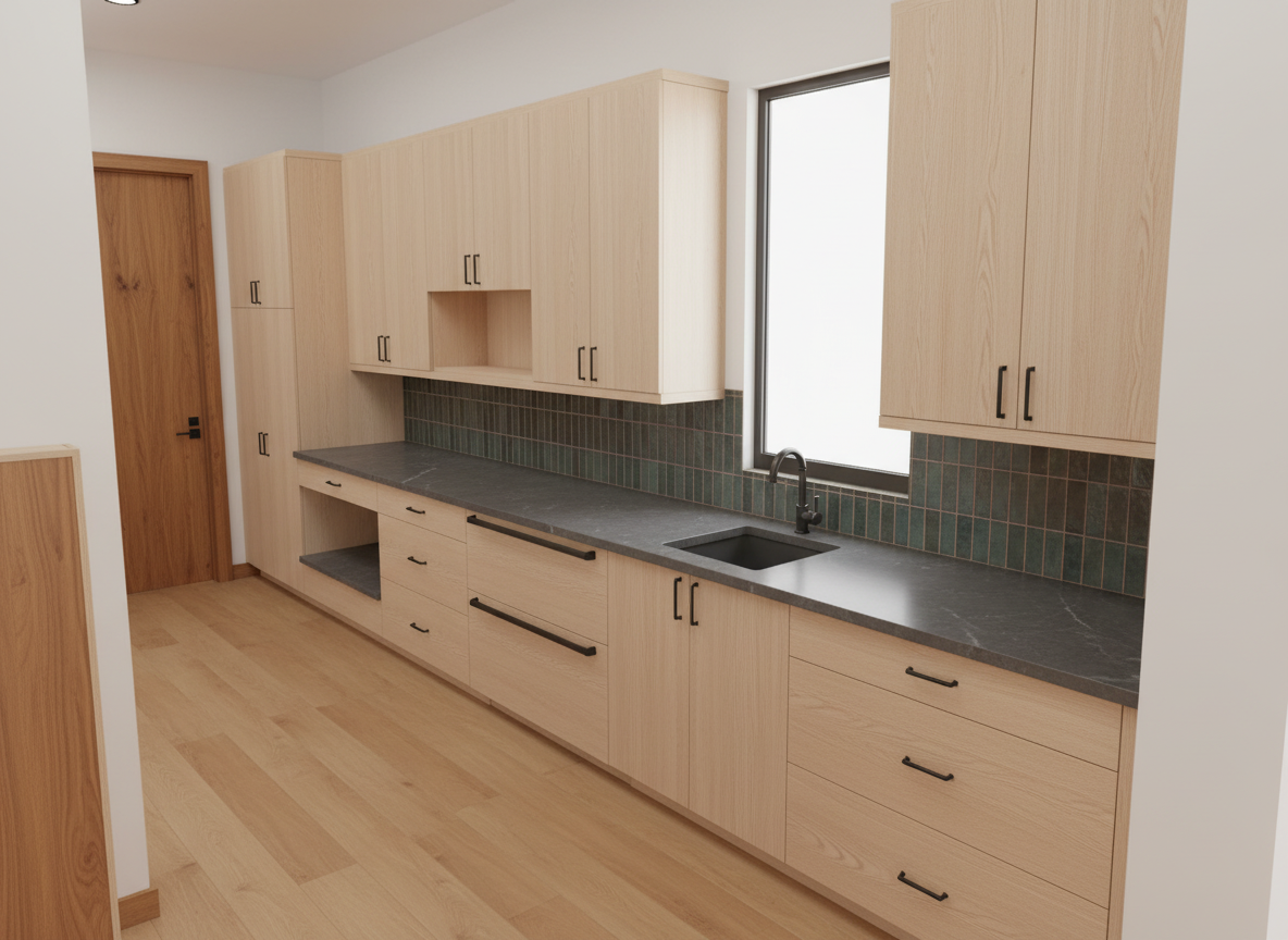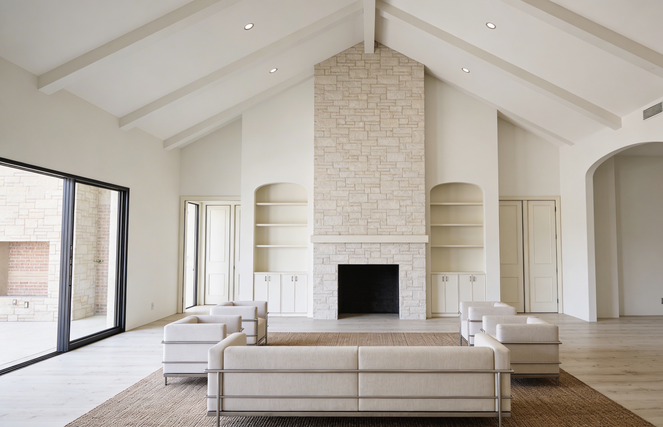 brown espresso brick light natural limestone black window frames bottom and top sills to match stone black shingles roof black fascia gutters and soffits on a clear sky spring afternoon