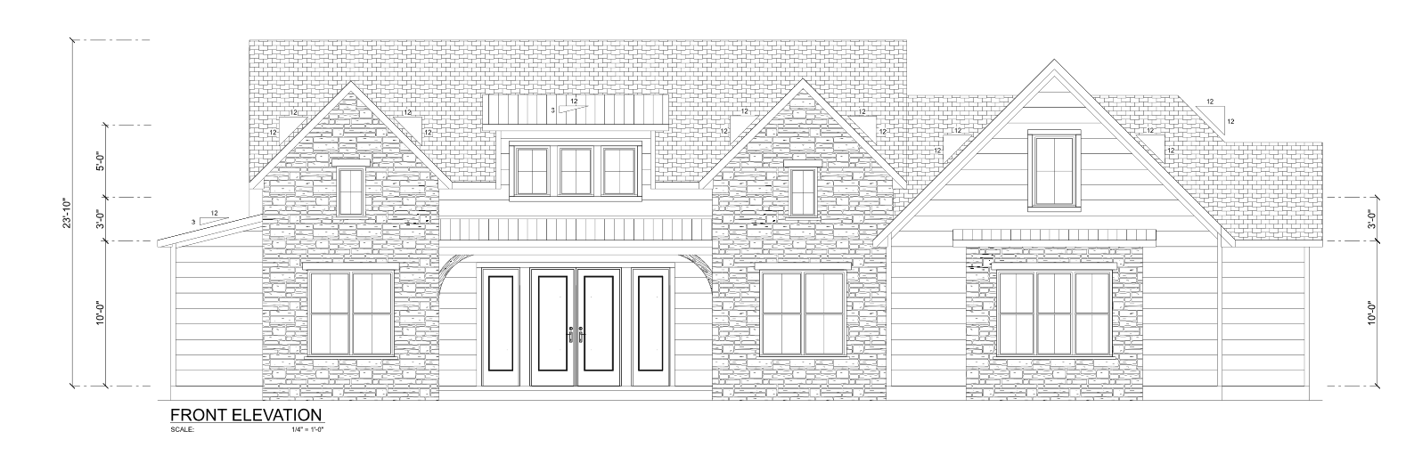 create a high quality photorealistic front elevation rendering of this home located in a spacious lot with a few trees exterior materials include primary and trim sherwin williams 7032 warm stone stone where shown orchard limestone in color alpaca windows bronze with colonial grid front door bronze iron with colonial grid lighting mood golden hour lighting with soft shadows realistic reflections and natural landscaping including olive trees hydrangeas and boxwoods camera perspective straight on front elevation view eye level with a slight wide angle lens no distortion rendering quality ultra realistic high resolution detailed textures clean lines subtle imperfections for realism no cartoon or stylized effects