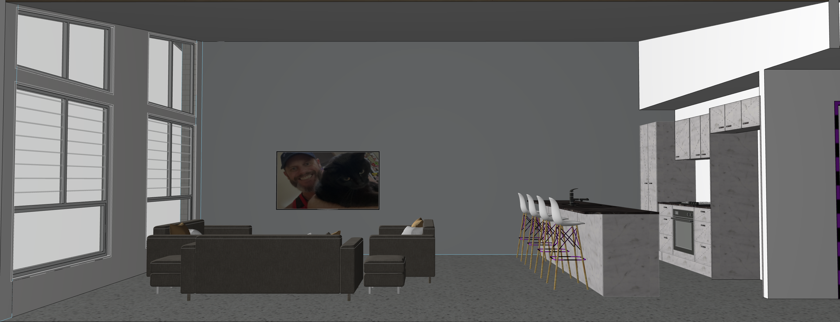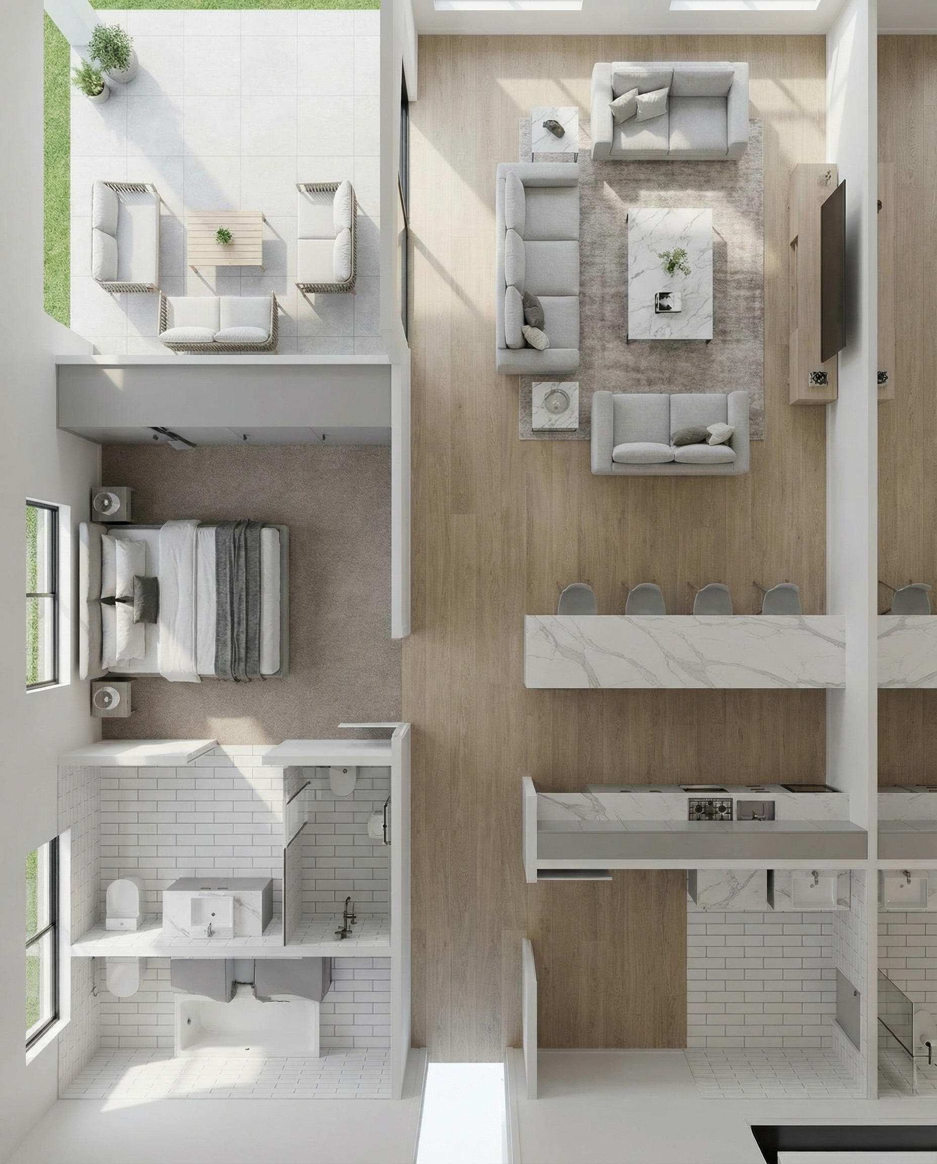 exterior shot exterior shot create exact render of the kitchen dining living area from this floor plan keep model geometry the same windows doors ceiling walls kitchen cabinetry ceiling is raked add luxury elements and luxury finishes on the materials and elements add wooden elements in combination with beige cream elements make a eye level render