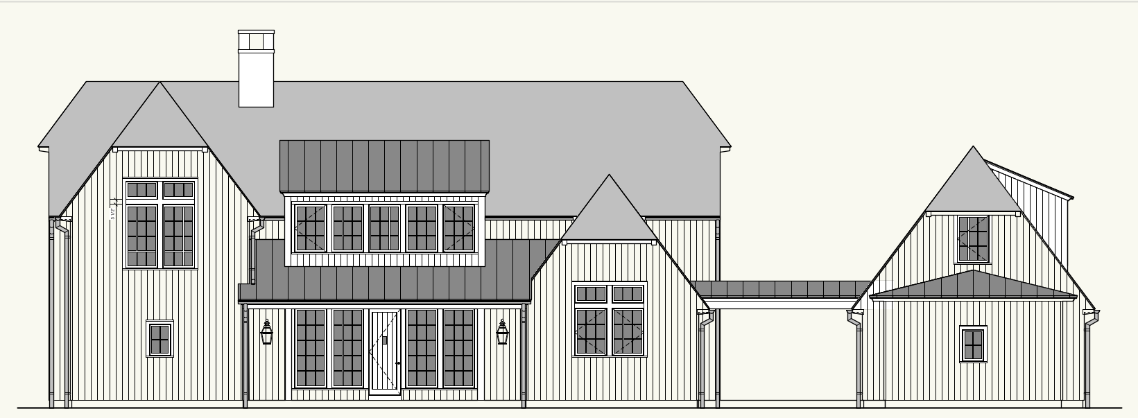 exterior shot render this elevation with white siding grey metal roof stone chimney white oak front door copper lantern sconces and light blue windows