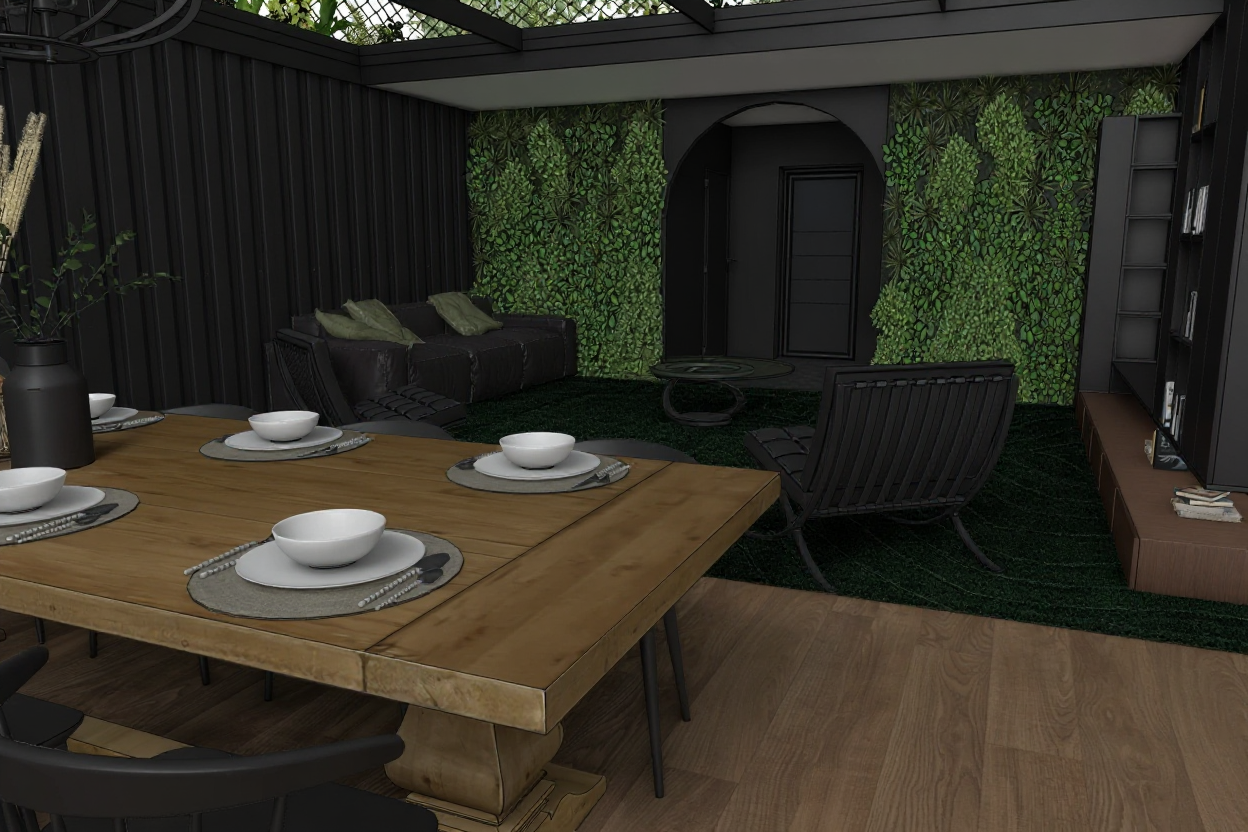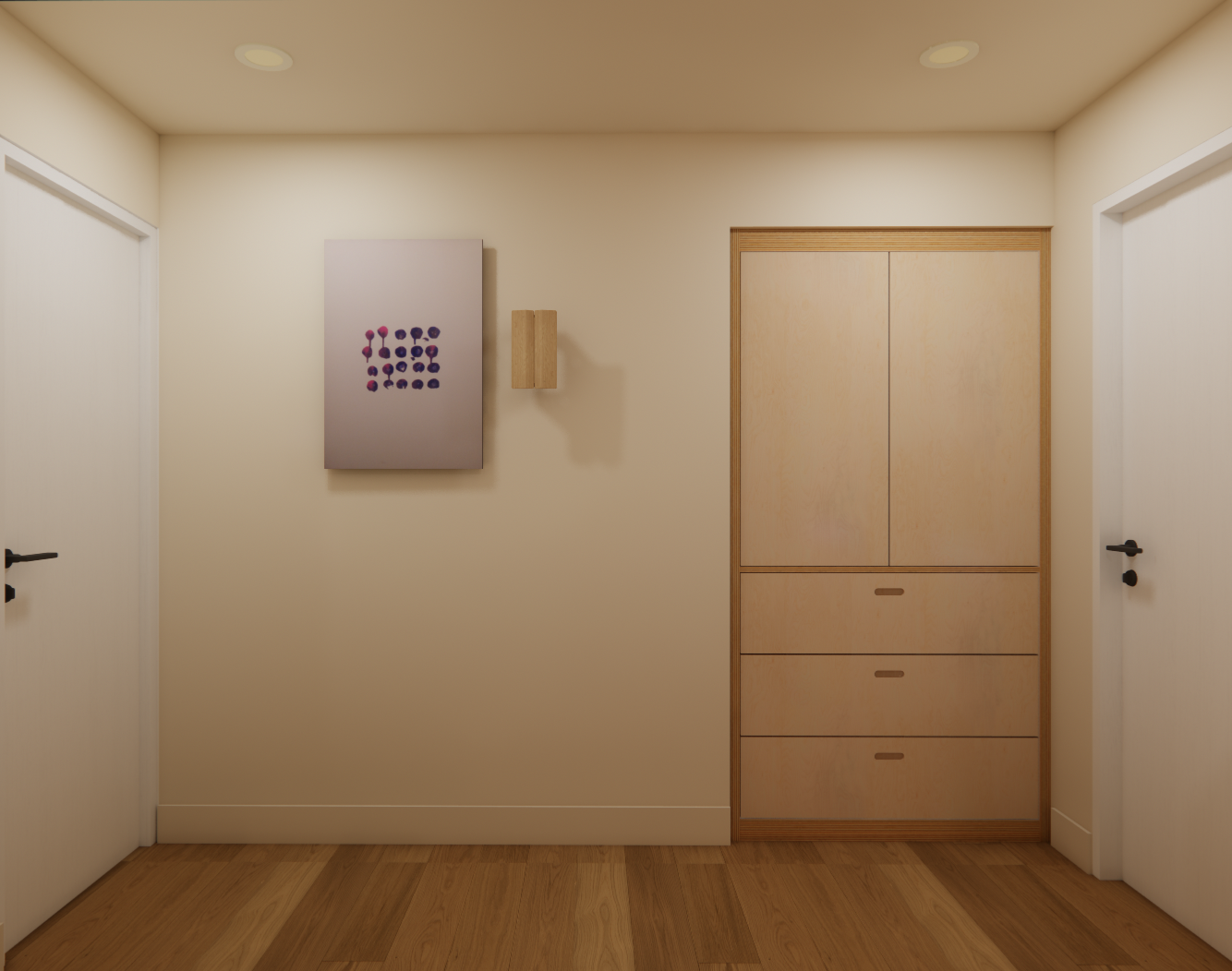 without sunlight only artificial light from recessed light no built in lights create a realistic render of this image maintaining all colors and materials