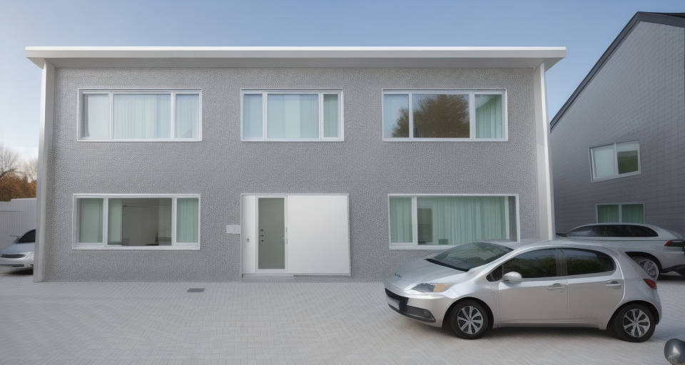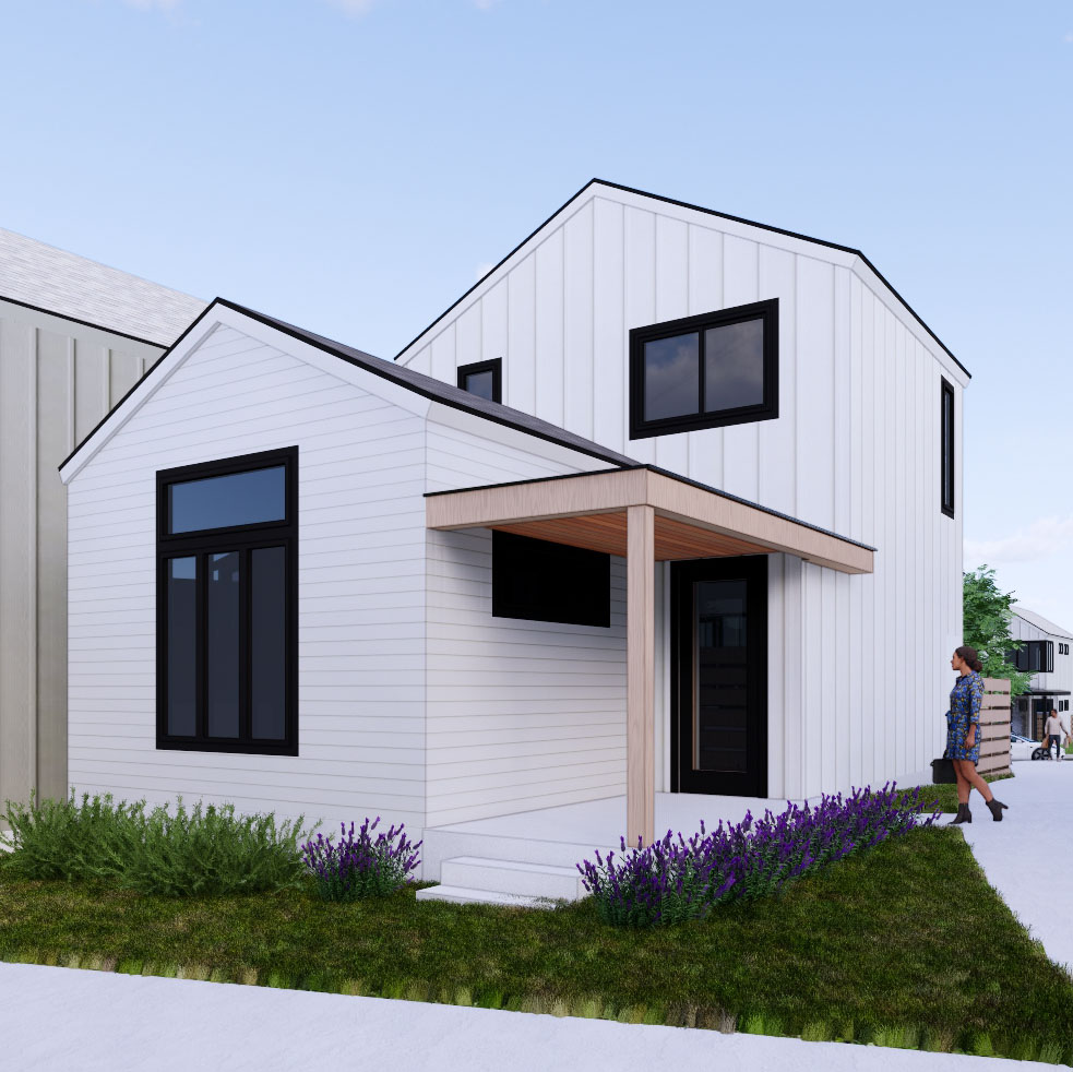 new urbanism exterior shot beautiful wooden white house sunny day black framed windows beautiful clouds architecture