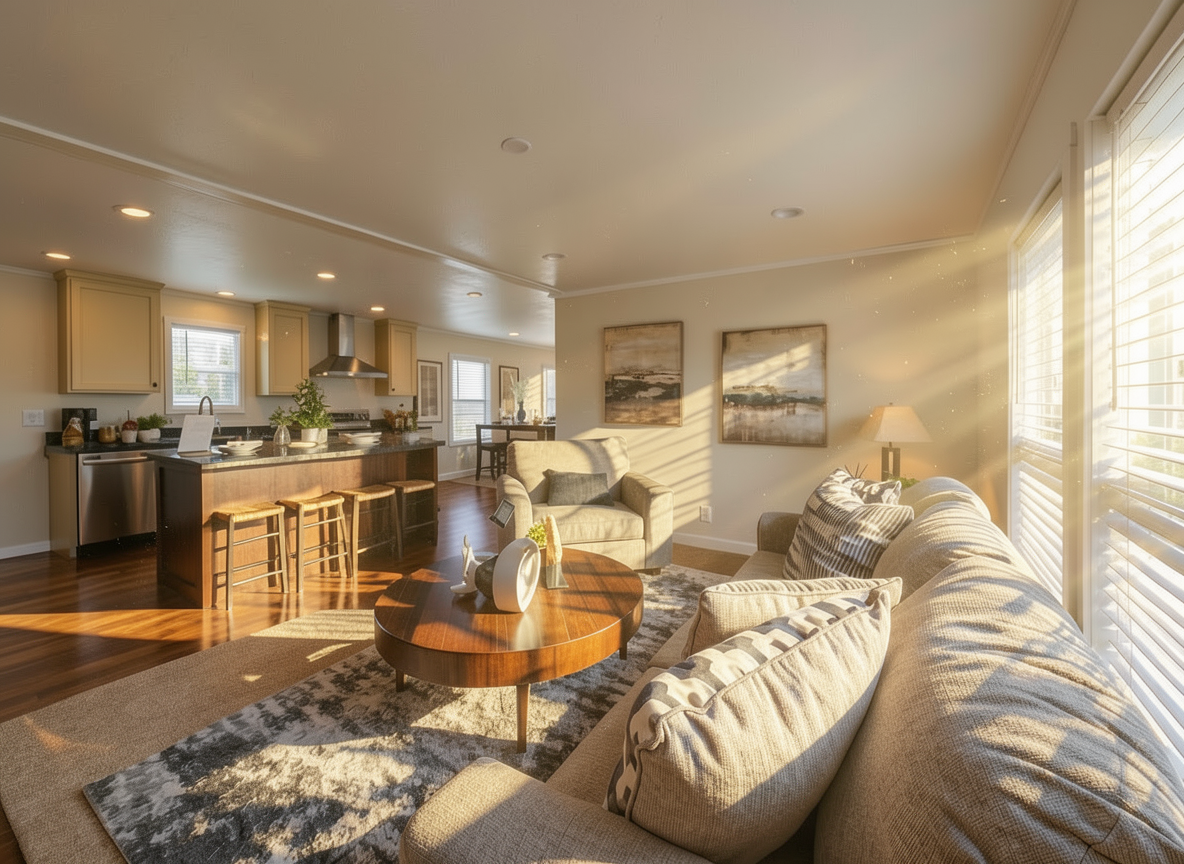 render this image as a high end photograph with realistic lighting coming through the window make the image look photorealistic and high quality do not change any furniture architecture carpet lighting or wood finishes render the image exactly the same as the attached image