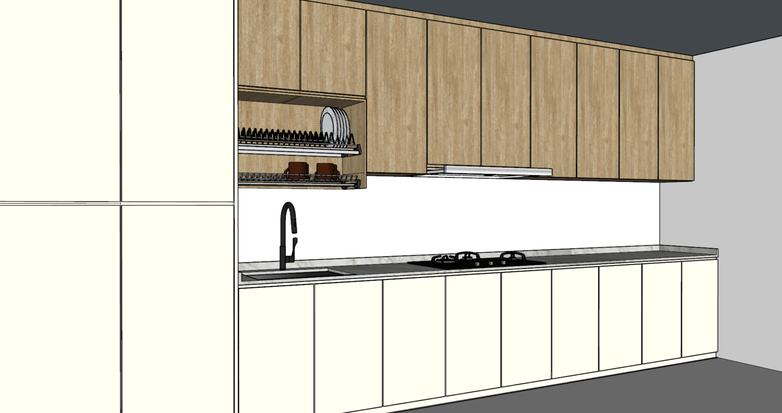 maintain existing style and material for new render ambience lighting realistic render natural lighting wall tiles to be grey stone look alike on side wall on the right floor tiles to be grey kitchen cabinet backsplash is white tempered glass