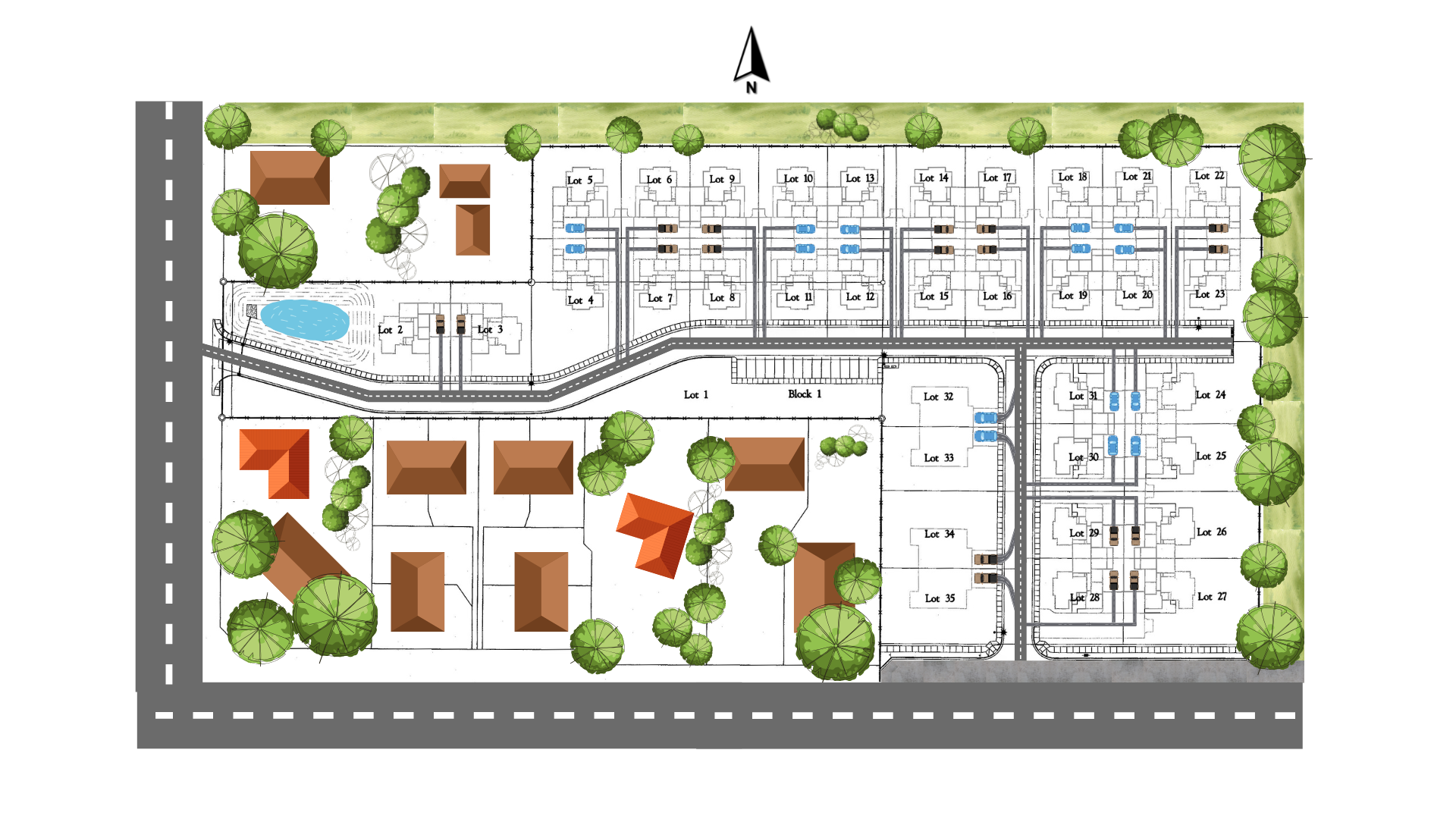 aerial shot convert this development site plan into a very simplified flat planning diagram remove all building interiors architectural details shadows and 3d elements show only clan lot outlines roads and clearly labeled lot numbers each unit should appear as a simple rectangular block with it lot reduce trees and landscaping to minimal symbols and use a flat top down map style suitable for a construction planning board