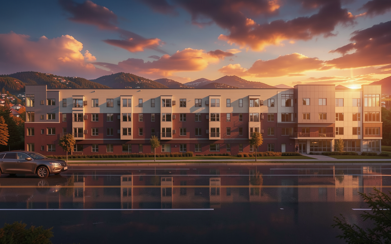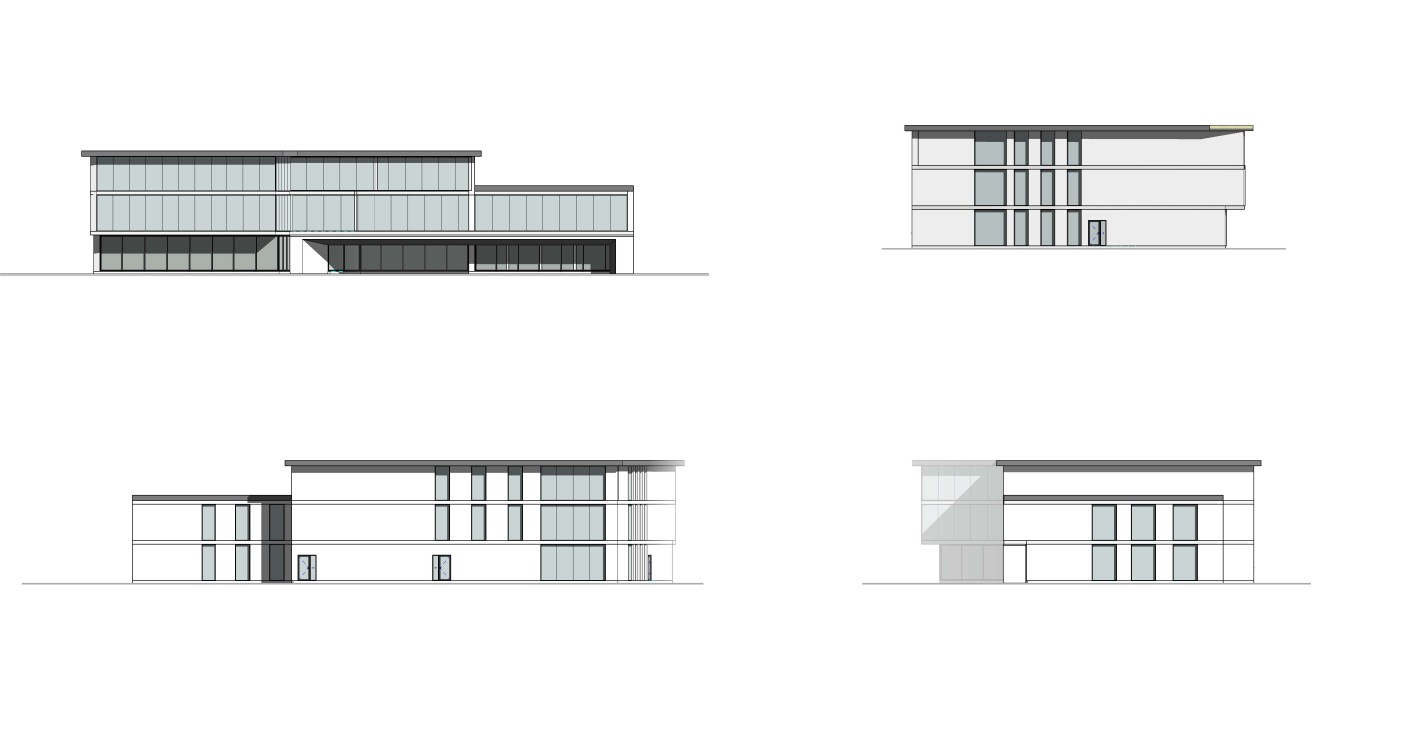 there are 4 library elevations on sheet 3 floors in each elevation use the exact building geometry from the provided elevation drawings do not change glazing proportions roof slope building footprint height or window positions do not redesign or reinterpret the architecture no new volumes no additional buildings no shape modification no people realistic architectural visualization emphysize the bold black frame under 2 floor human eye level perspective street level view pedestrian point of view no aerial view no top down angle natural camera height 1 6 1 7 meters ground floor recessed inward clearly visible setback from upper floors strong horizontal shadow line between recessed ground floor and upper volume floating upper floors effect architectural depth and clear floor articulation darker tinted architectural glass bronze to graphite tone reflective but deep glass reduced transparency from outside high performance low iron glazing interior visible through glass clearly separated floor slabs inside multiple library levels visible simultaneously bookshelves aligned per floor reading areas tables circulation no single tall bookshelf spanning multiple floors realistic library interior layout calm intellectual atmosphere warm interior lighting contrasting with dark glass perforated metal panels and fins in grey color as facade accents rhythmic vertical composition strong contrast between metal and dark glass evening golden hour lighting soft sky subtle clouds realistic shadows emphasizing depth premium nordic european contemporary architecture professional architectural photography style ultra realistic archviz high detail cinematic but realistic