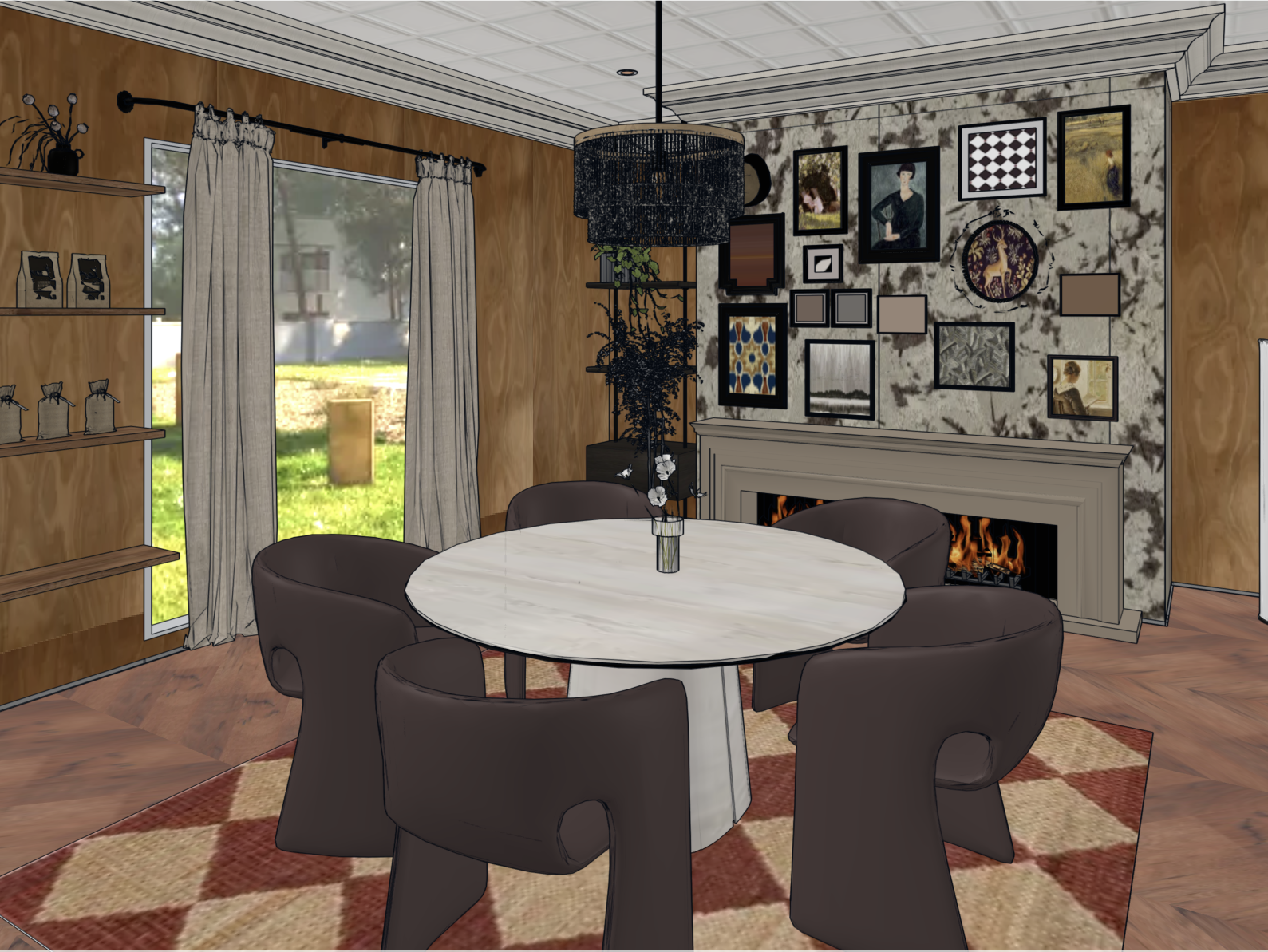 turn on all lighting in the scene change the central pendant light material to gold metal soft warm glow all lights with subtle brightness sharp crisp and photorealistic image quality