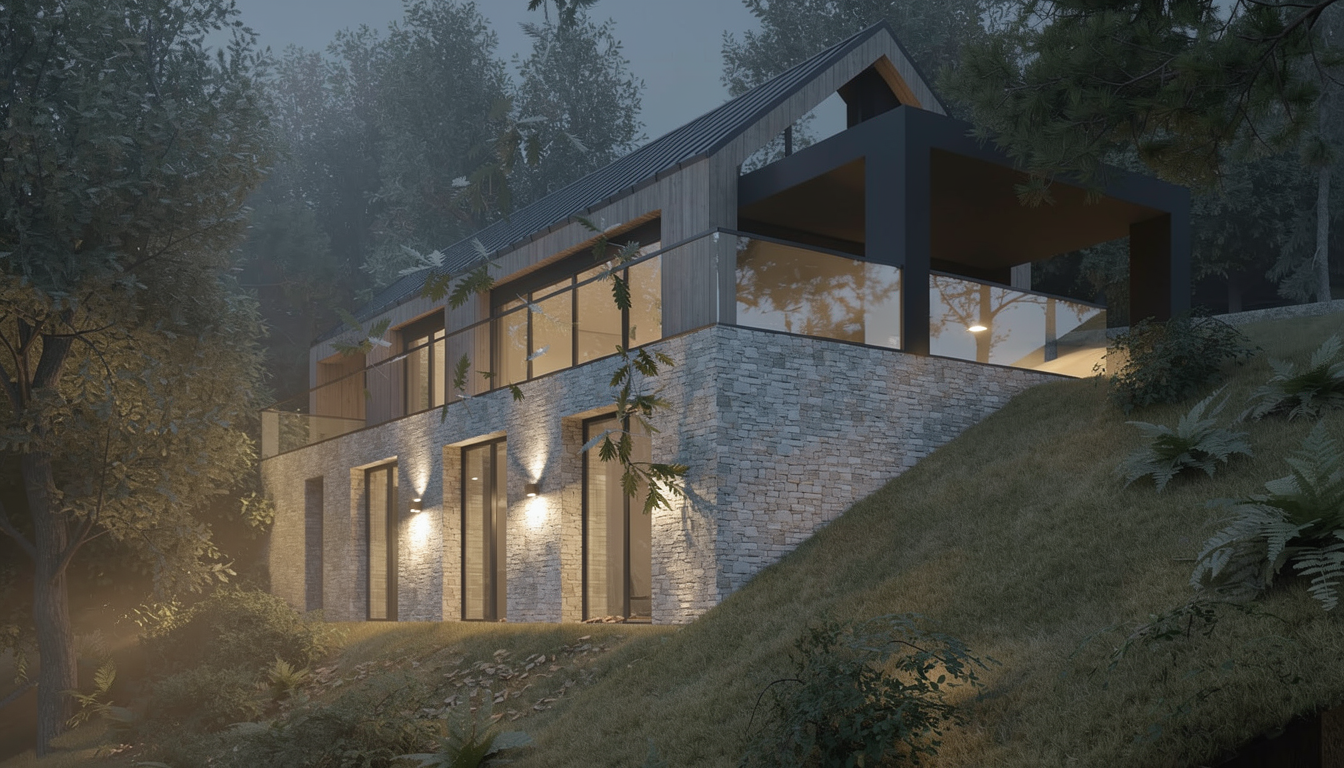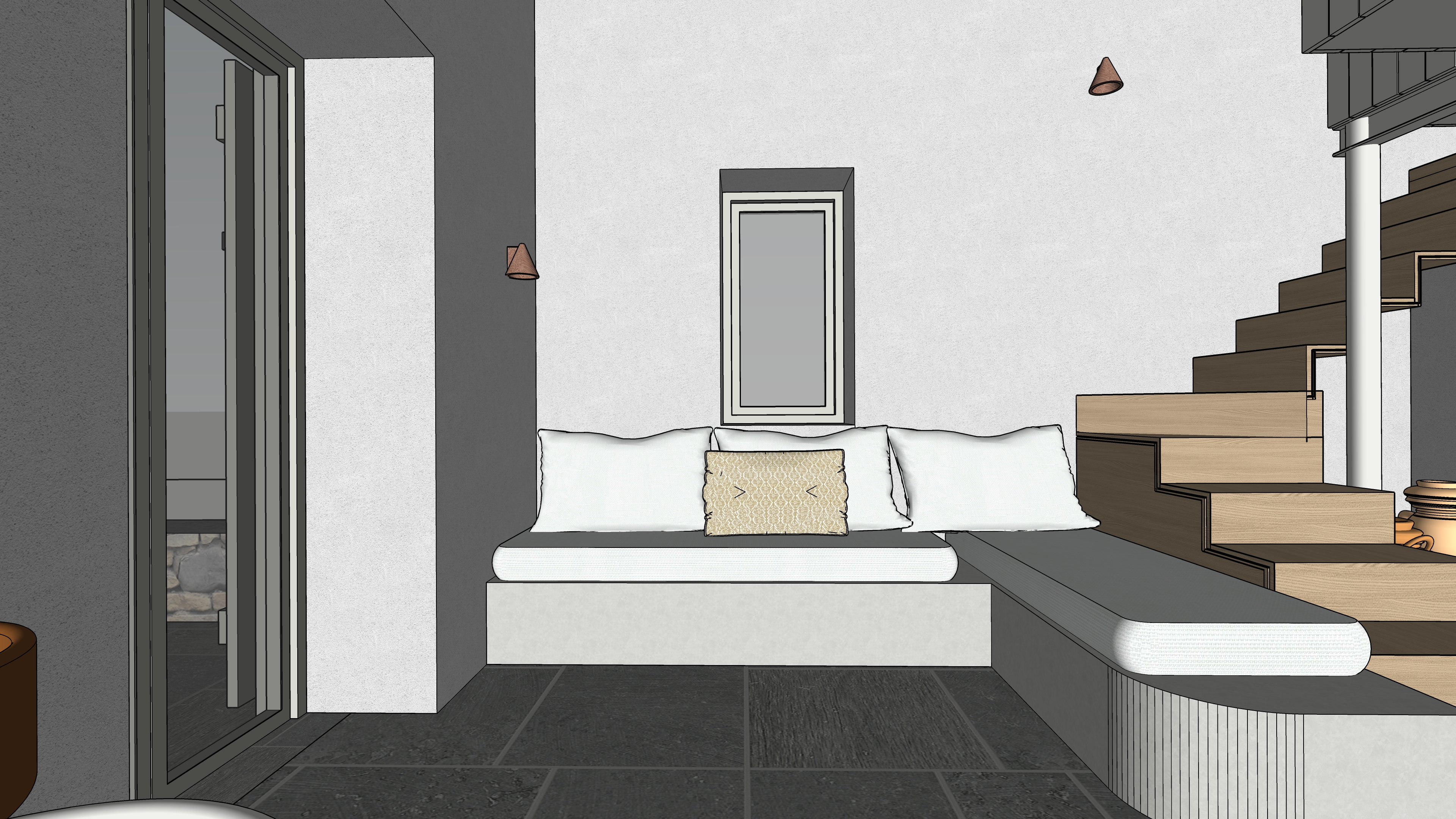 main prompt this is a cycladic house in kythnos the floor is natural gray pelion stone the sofa is white cement paint the sofa fabrics are light cream there is wooden stair leading to the mezzanine which is made of metal and wood in white color the stair is light oak wood the window frames are sage green the walls are white there is natural light negative prompt do not change geometry do not add objects do no change colors or materials