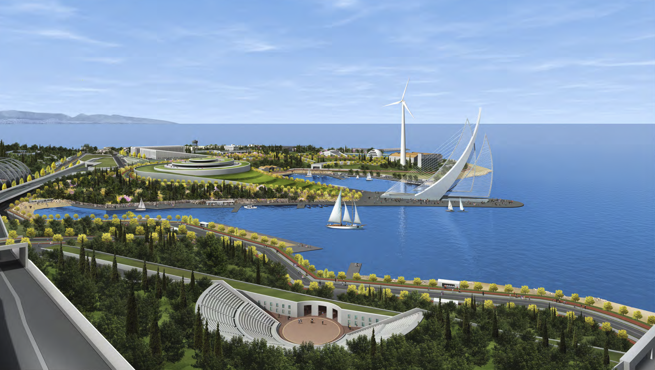 create a stunning futuristic coastal landscape featuring a vibrant high tech park the scene includes lush green terraces and domed structures highlight a sleek white wind turbine and an elegant futuristic bridge use a serene blue for the ocean and the sky the atmosphere should be bright and lively with sailboats gliding peacefully on the water incorporate bright yellow and green trees lining the pathways and ensure the distant mountains are painted in soft grays and blues capture a sense of innovation and tranquility throughout the environment