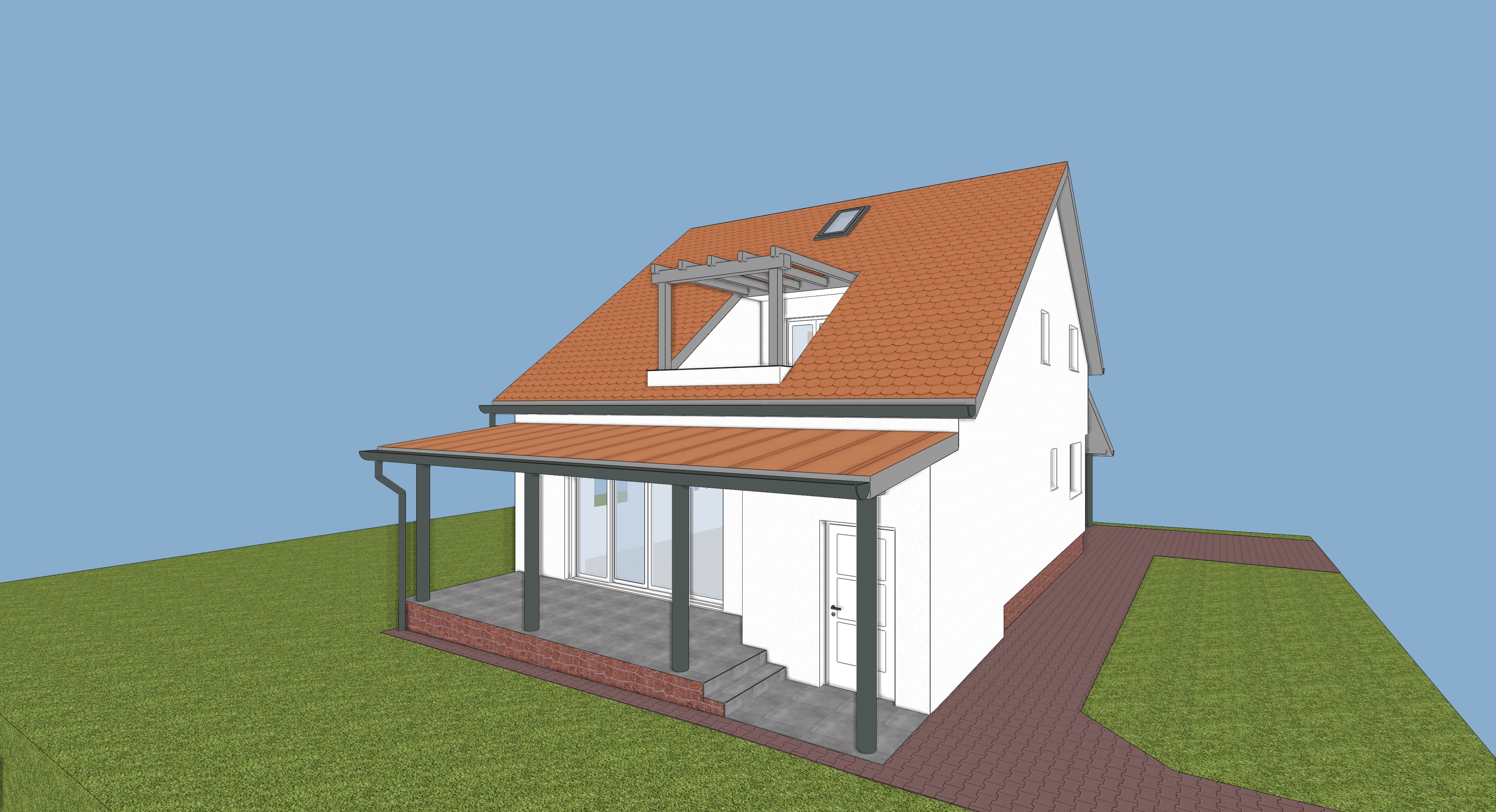 trees and bushes on the perimeter few small house on the background clear sunny sky with some clouds light gray color on the wood parts of the roof dark gray color on the gutter and columns white plaster on the walls white doors