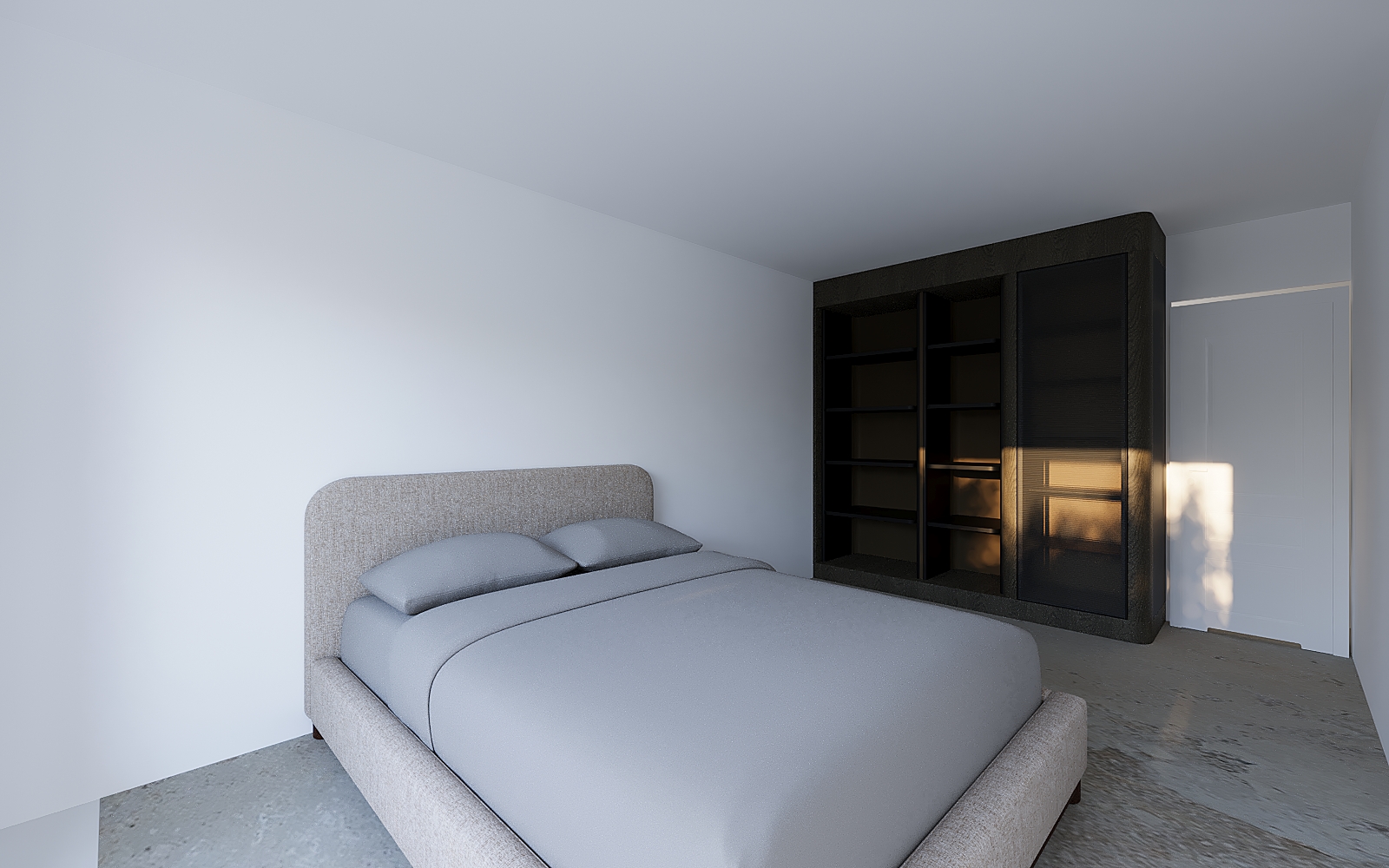 guest bedroom jerusalem stone flooring all around the room nice clear beige bouclette tones bed with brown cushions and with wood panels on the wall behind the bed side tables with round lamps on them transparency with led in the closet one hanging part one drawers part ceiling with a contemporary molding in periphery and led indirect