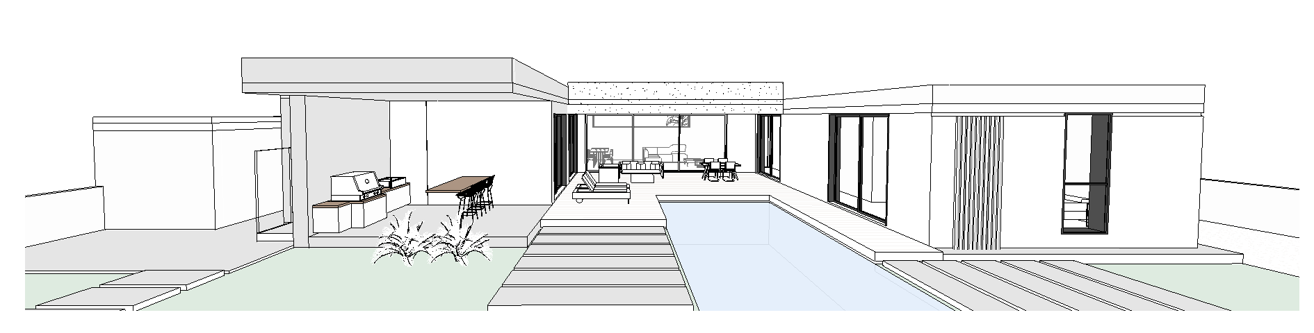 ultra realistic modern minimalist villa backyard courtyard private enclosed space with clean white stucco and smooth concrete architecture strong horizontal lines and flat roof volumes large floor to ceiling sliding glass doors opening to outdoor living area seamless indoor outdoor connection central rectangular swimming pool with clear blue water subtle ripples and realistic reflections surrounded by light stone or concrete coping wooden deck terrace with built in seating and lounge furniture step down platform design leading to the pool balanced and symmetrical composition left side features a covered outdoor kitchen and bar area with minimalist design right side includes clean fa ade with vertical wood slats and large windows landscaping minimal and refined small planted areas with tropical plants and soft greenery no excessive vegetation clean edges and modern landscape design environment fully private courtyard enclosed by the architecture no visible neighboring buildings no background distractions calm and controlled space lighting warm golden hour sunlight soft cinematic shadows natural light reflecting on water surface subtle warm interior lighting visible through glass materials matte white stucco light grey concrete natural wood decking and accents large glass panels with realistic reflections soft material imperfections for realism water highly realistic pool surface with light movement reflections of sky and architecture subtle caustics camera eye level or slightly lowered perspective aligned with the pool 24 28mm lens centered composition emphasizing depth toward the interior space render style ultra photorealistic high end architectural visualization global illumination ray tracing ambient occlusion sharp details mood calm luxurious private resort atmosphere serene and inviting a couple of people subtly placed in the lounge area slightly blurred for realism and soft water reflections dancing on nearby walls and surfaces