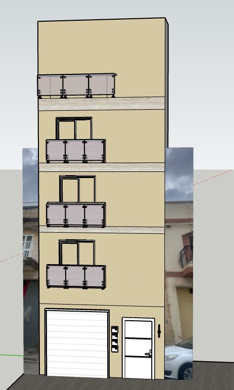 ultra realistic architectural render of a contemporary mediterranean apartment facade based on the provided sketchup model maintain exact geometry proportions and design facade material smooth painted masonry rendered plaster finish in a warm sand beige color the surface must appear clean even and contemporary not natural stone not textured limestone not aged or weathered finish should be matte fine grain plaster with subtle realism very light imperfections only consistent color tone across the facade include refined horizontal travertine bands as accent elements only clearly distinguish from the main plaster surface balconies with clear glass railings minimal metal framing realistic reflections and transparency apertures windows and doors in crisp white sharp and modern lighting natural mediterranean daylight soft warm sun realistic shadows environment clean residential street minimal context no aging or decay rendering style high end architectural visualization clean modern newly built appearance important avoid any old worn dirty cracked or historic stone textures the building should feel newly constructed and well finished