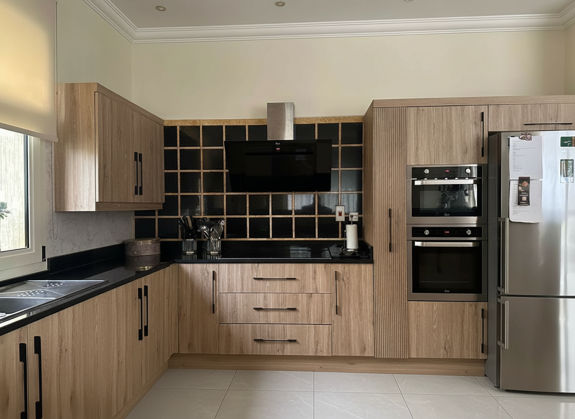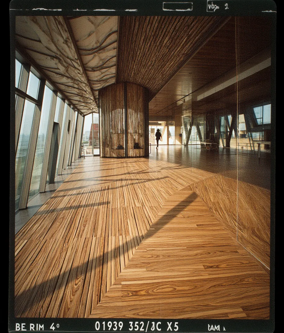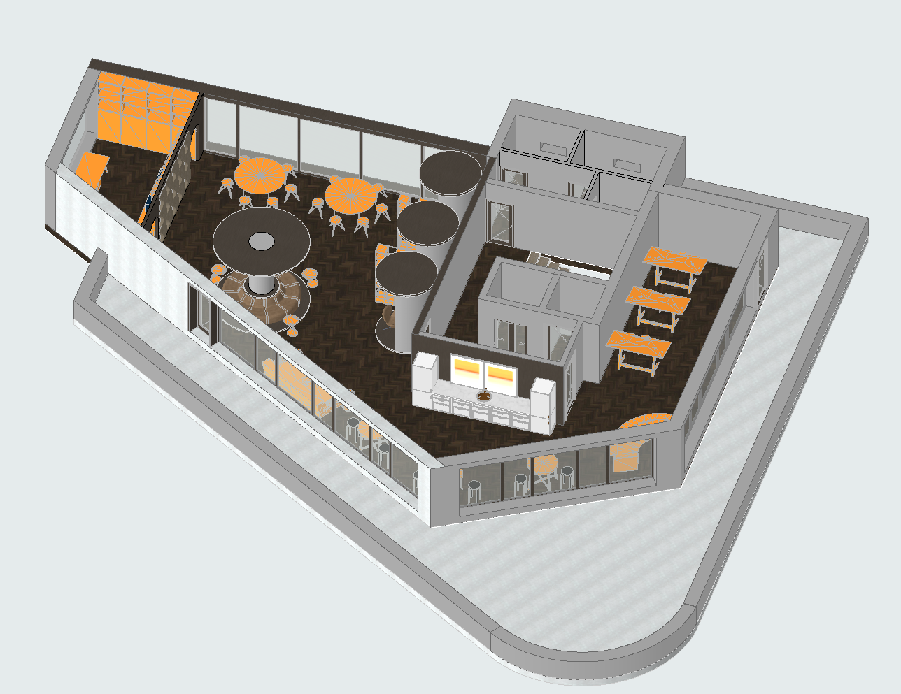 subject viewpoint a hyperrealistic architectural rendering in axonometric bird s eye view based exactly on the layout and geometry provided in the reference image the view is a roofless cutaway of a contemporary cafe and coworking space materials textures flooring rich dark smoked oak herringbone parquet flooring throughout the main areas with realistic grain and a subtle sheen walls smooth matte grey plaster on all solid walls and the central core block windows large floor to ceiling glass curtain walls on the left and bottom perimeter with dark aluminum frames clear glass showing realistic reflections kitchen area minimalist white cabinetry white subway tile backsplash with contrasting grout and brushed stainless steel appliances and faucet central core exposed top edges of the grey walls showing thickness concrete stair treads furniture fixtures orange accents vibrant orange industrial style barstools at high tables and round cafe tables orange metal shelving units along the back wall with realistic props books plants booth seating large circular custom booth with textured grey fabric upholstery and a dark central table general all furniture should have realistic textures fabric weaves and metal finishes lighting atmosphere lighting style soft diffuse high end architectural studio lighting global illumination the light comes from above casting gentle realistic soft shadows beneath tables chairs and walls to define depth and volume mood clean bright sophisticated and highly detailed photographic quality no roof structure is visible