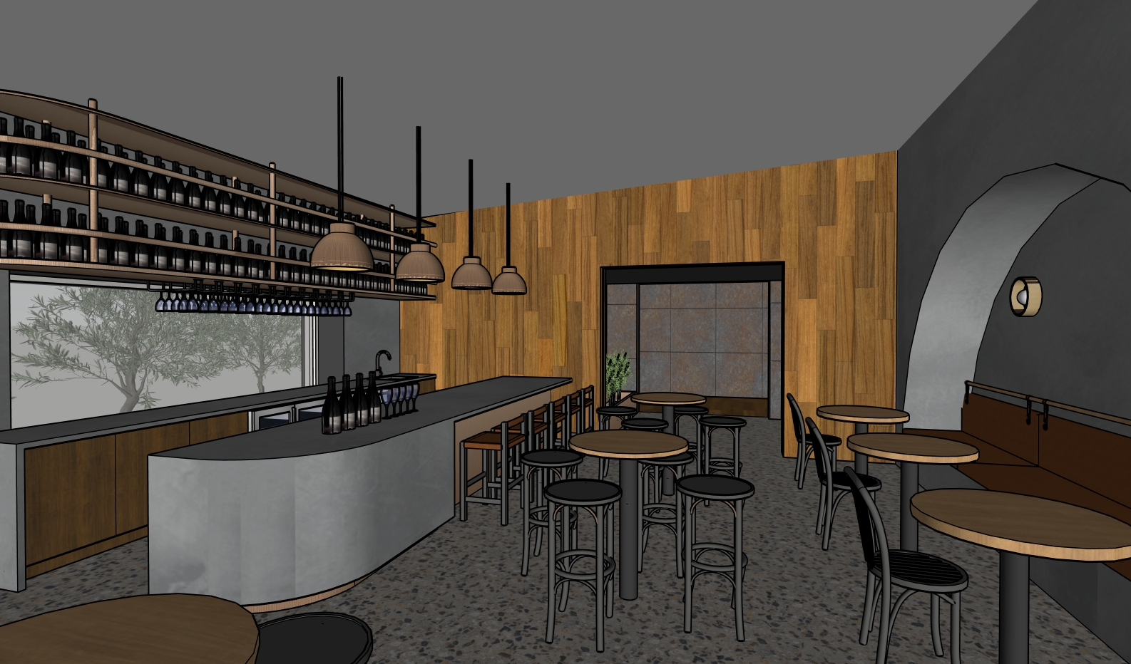 photorealistic interior photography style natural dynamic range balanced exposure slight softness in highlights realistic material imperfections shot as if on a professional full frame camera with natural interior lighting lower window brightness and reduce overexposed exterior light lights to be brushed brass texture curved concrete bar to be finished in microcement with a continuous seamless surface and no vertical joint lines maintain timber panelling in doorway tiled wall at very end of the view is corten steel dark earthy tones banquette seating is brown aged leather plastered wall curve to be seamless with no visible joint lines hanging glasses are clear bottles above window are wine bottles all to be uniform as per original sketch chair and stools to be black timber