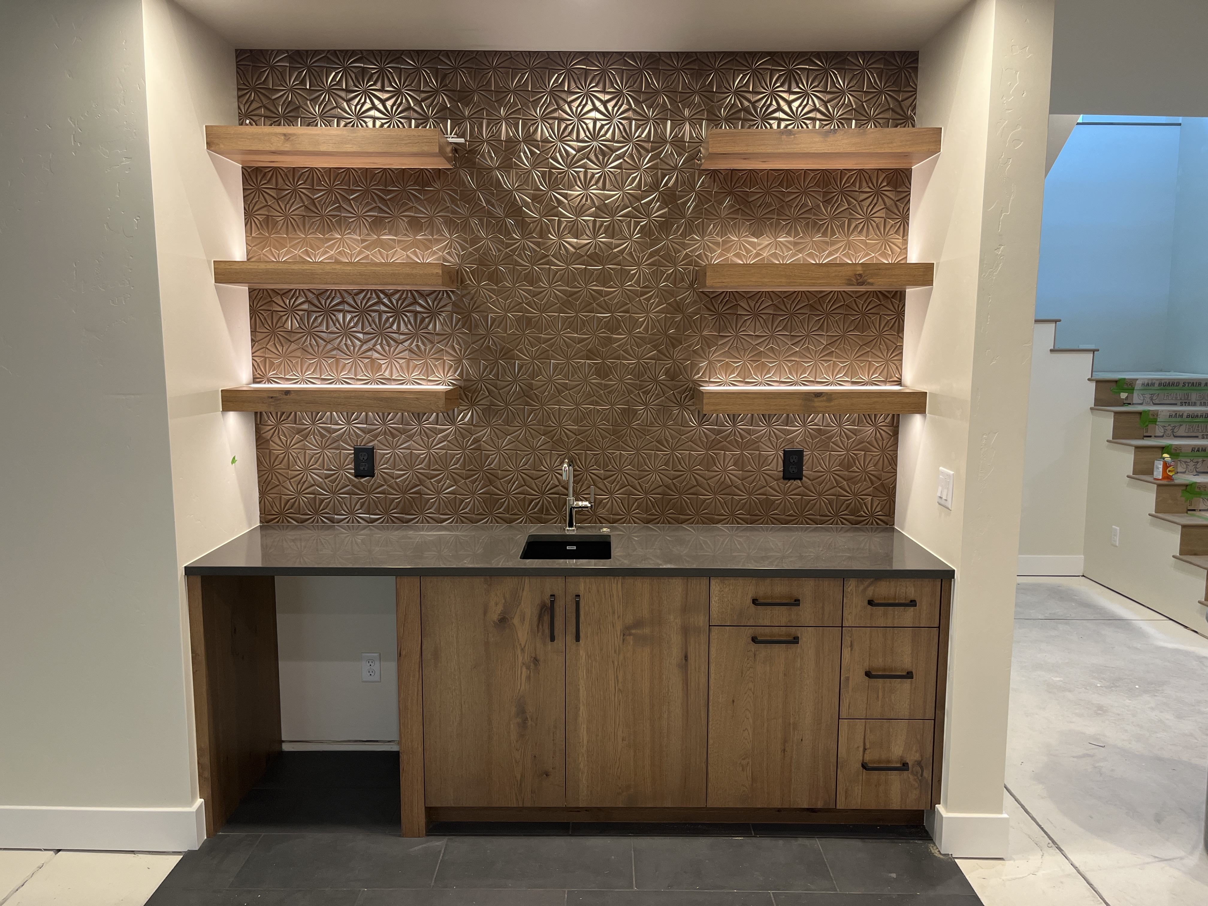add under counter beverage fridge into opening on the left add glasses and liquor bottles to shelves