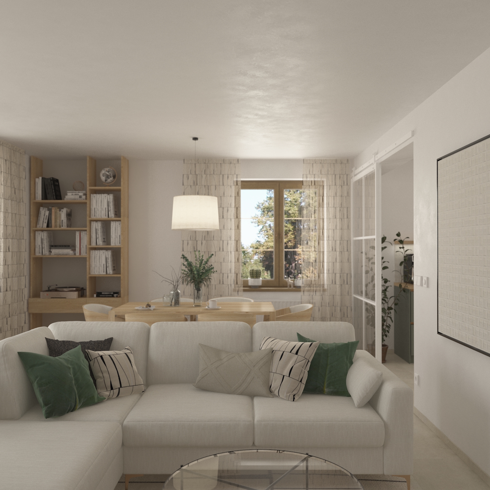 create a realistic visualization with the evening sun sunlight passes from the left side the window in the visualization is northern