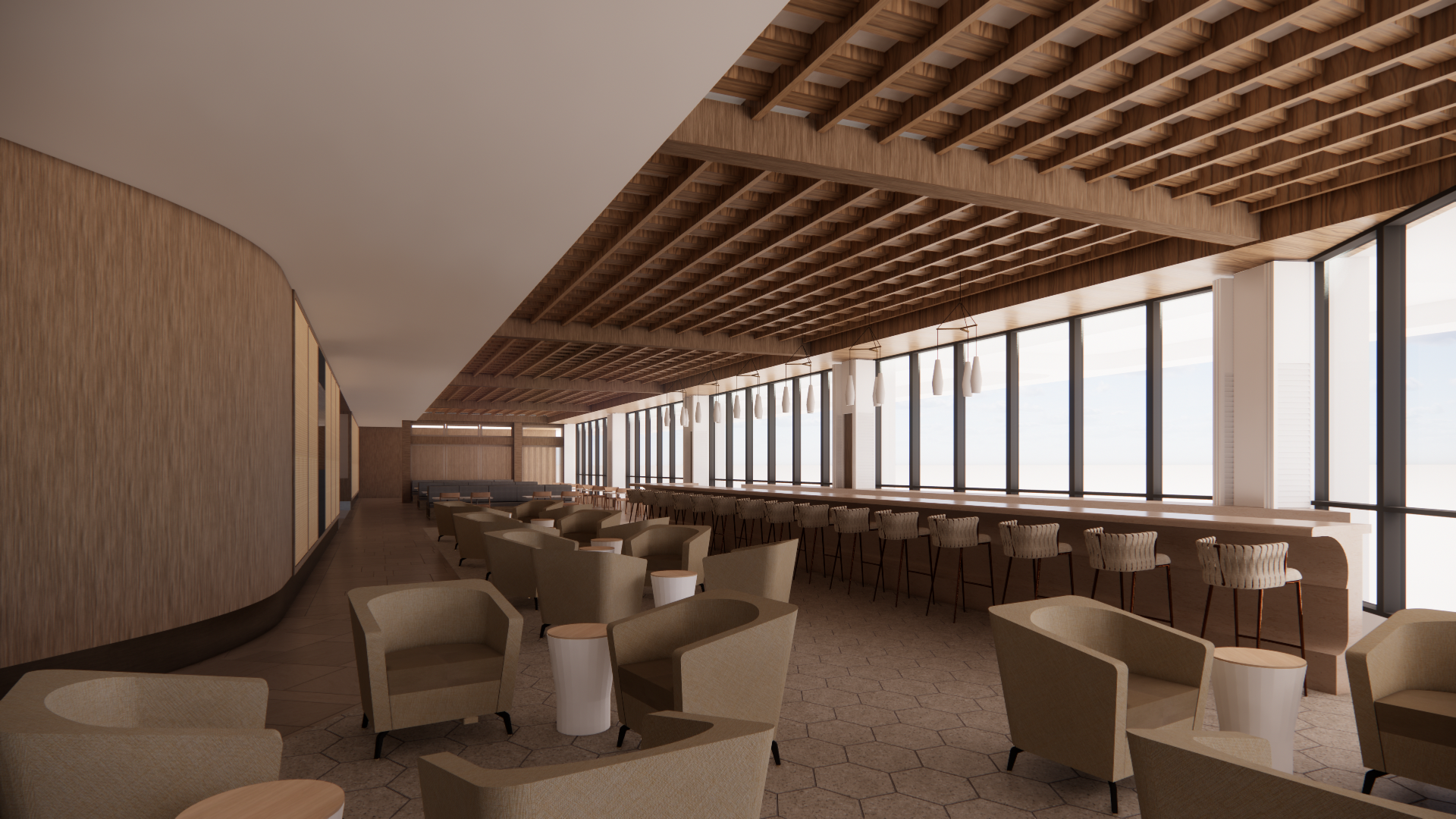 nordic interior shot airport premium lounge there is view to the airfield add realistic details of bar no bar back wall or shelves add beer tap make the space bright yet swanky add some lights on the wood grid ceiling add people add area rug where lounge chairs are architecture