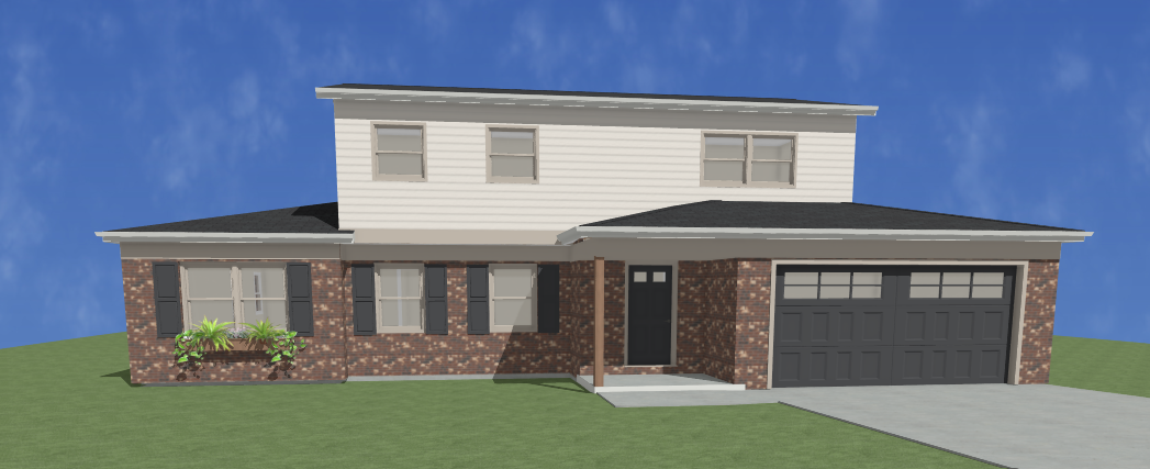 place in a suburban neighborhood with a large driveway in front paint the brick a warm cream color with a teal blue front door a wooden garage door and wooden shutters