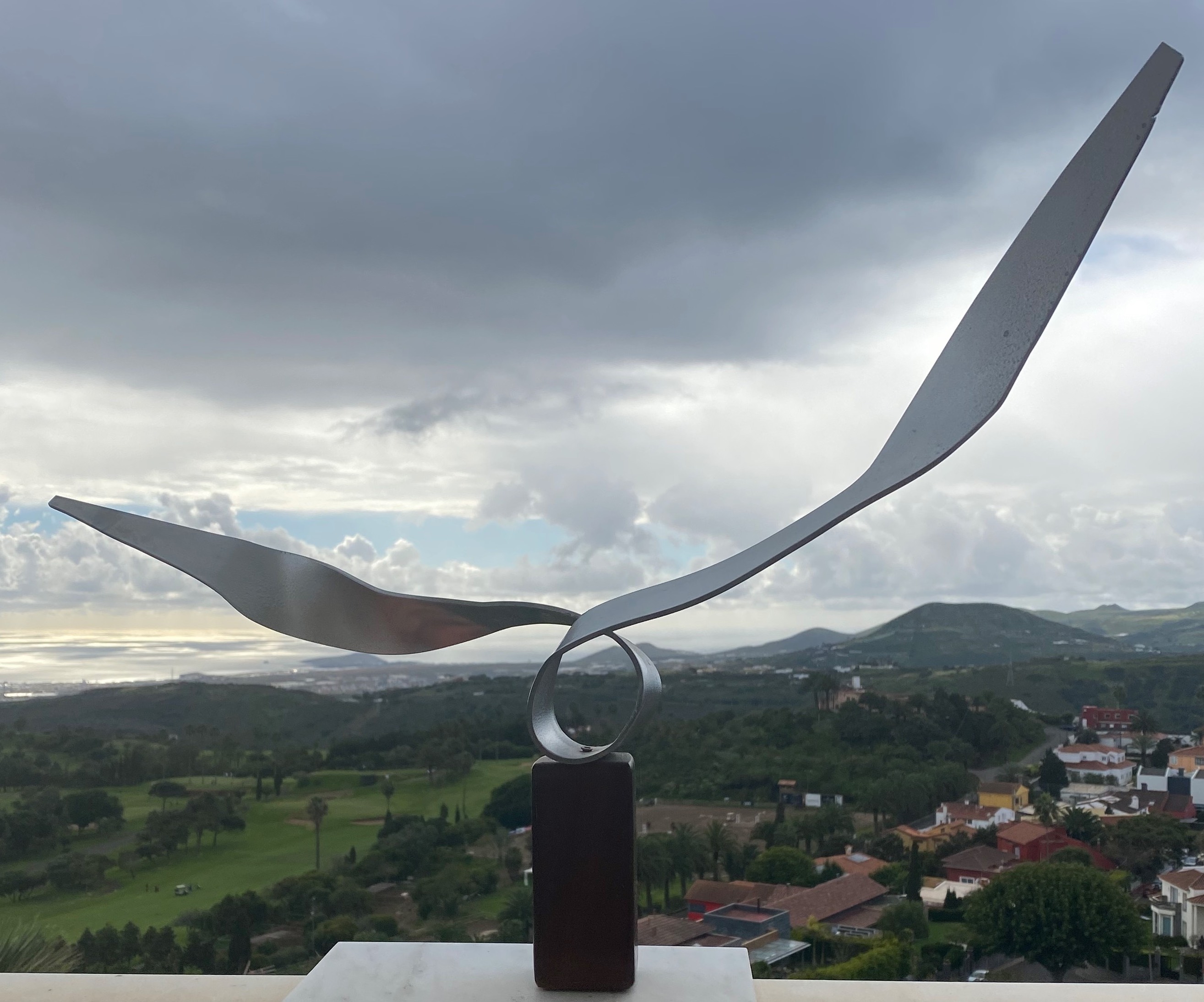 the sculpture will be exactly as pictured without any additions made of highly polished stainless steel and will stand on a pedestal five times the height of the figure this pedestal will be made of exposed reinforced concrete with a plaque that reads j livingstone s and author luis s robayna it will be located loooking the sea a small lawn with a single low shrub will surround it
