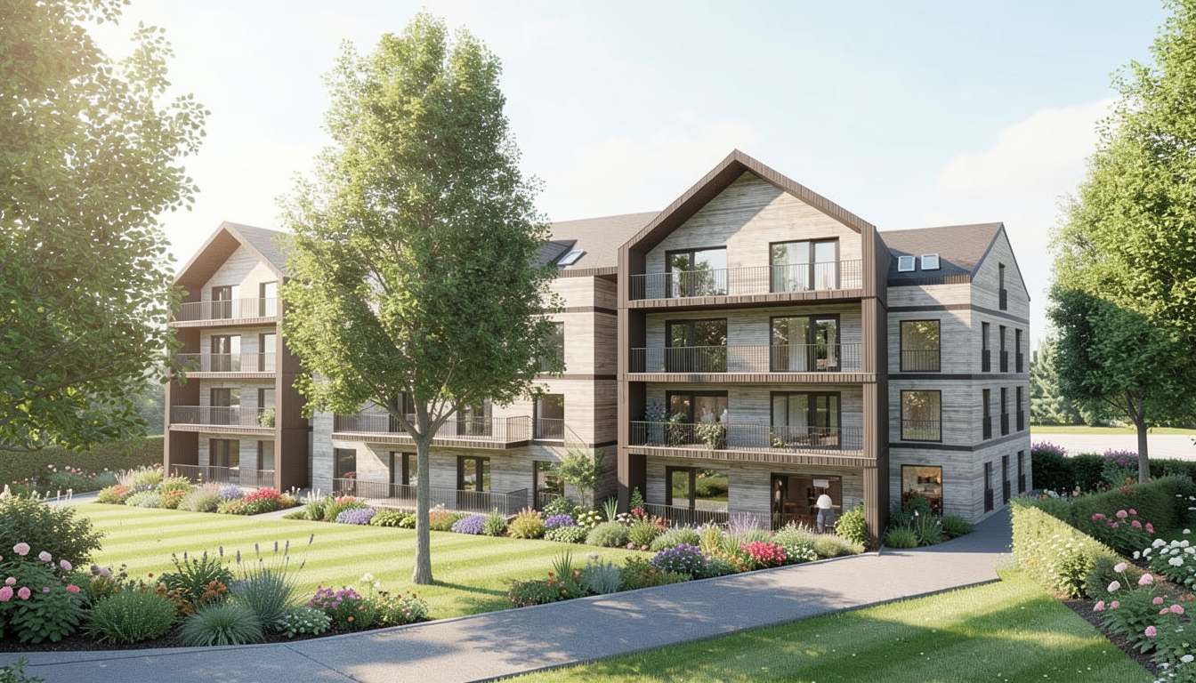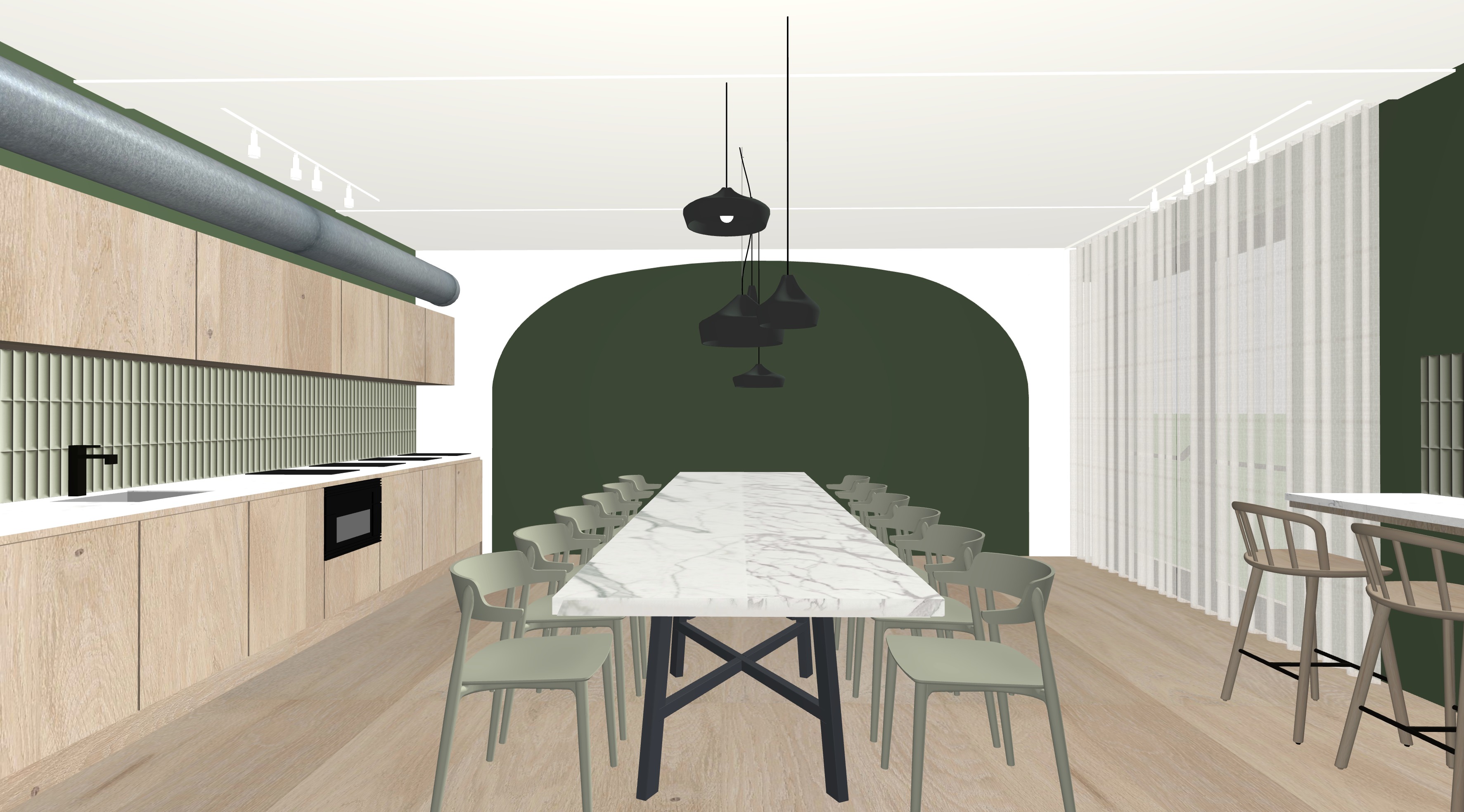 e una sala per cene a terra abbiamo un pavimento in parquet in rovere chiaro continuo a liscio sulla parete di sinistra c sopra alla cucina un tubo in acciaio zincato la cucina ha una strip led sotto i pensili e il fondo in piastrelle verde opaco in rilievo leggermente bombate nella parete di fondo dipinto un arco verde il resto delle pareti sono bianche al centro abbiamo una tavola con il piano in marmo calacatta e gambe in ferro nero sopra alla tavola ci sono delle lampade a sospensione in ceramica opaca verde e sono accese le sedie sono in legno di colore verde sulla parete di destra ci sono sgabelli in legno e un pianale bianco con sotto una strip led metti qualche piatto sparso sulla tavola per simulare una cena gi iniziata e qualche attrezzo sulla cucina in esterno simula una luce di tarda serata con sfondo di alberi