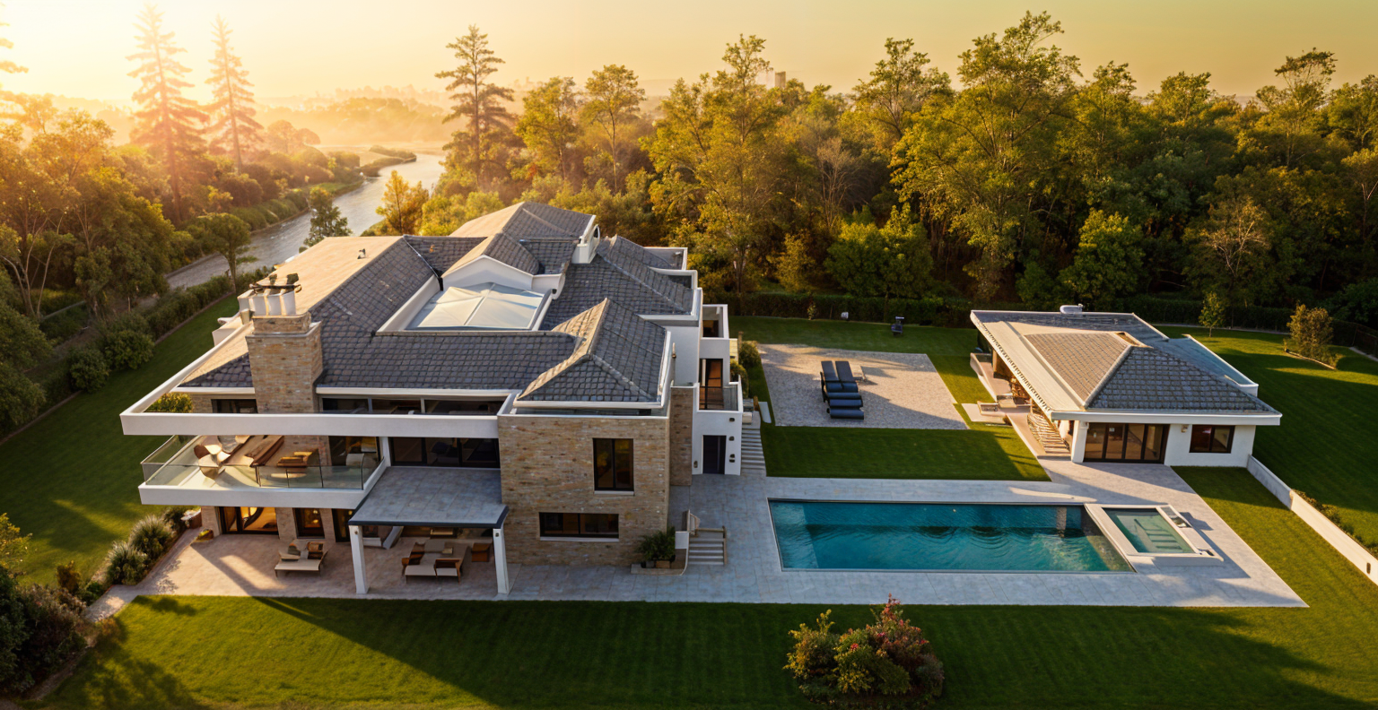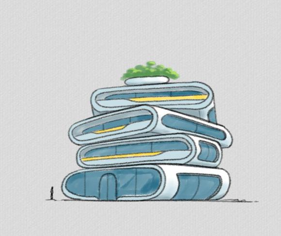 futuristic multi layered building with a sleek design featuring smooth curved lines the building exterior is a bright glossy white with large transparent blue tinted glass panels each floor has glowing warm yellow accents visible through the windows the top layer is adorned with lush vibrant green foliage adding a touch of nature the atmosphere is serene and modern with a hint of minimalistic elegance architecture
