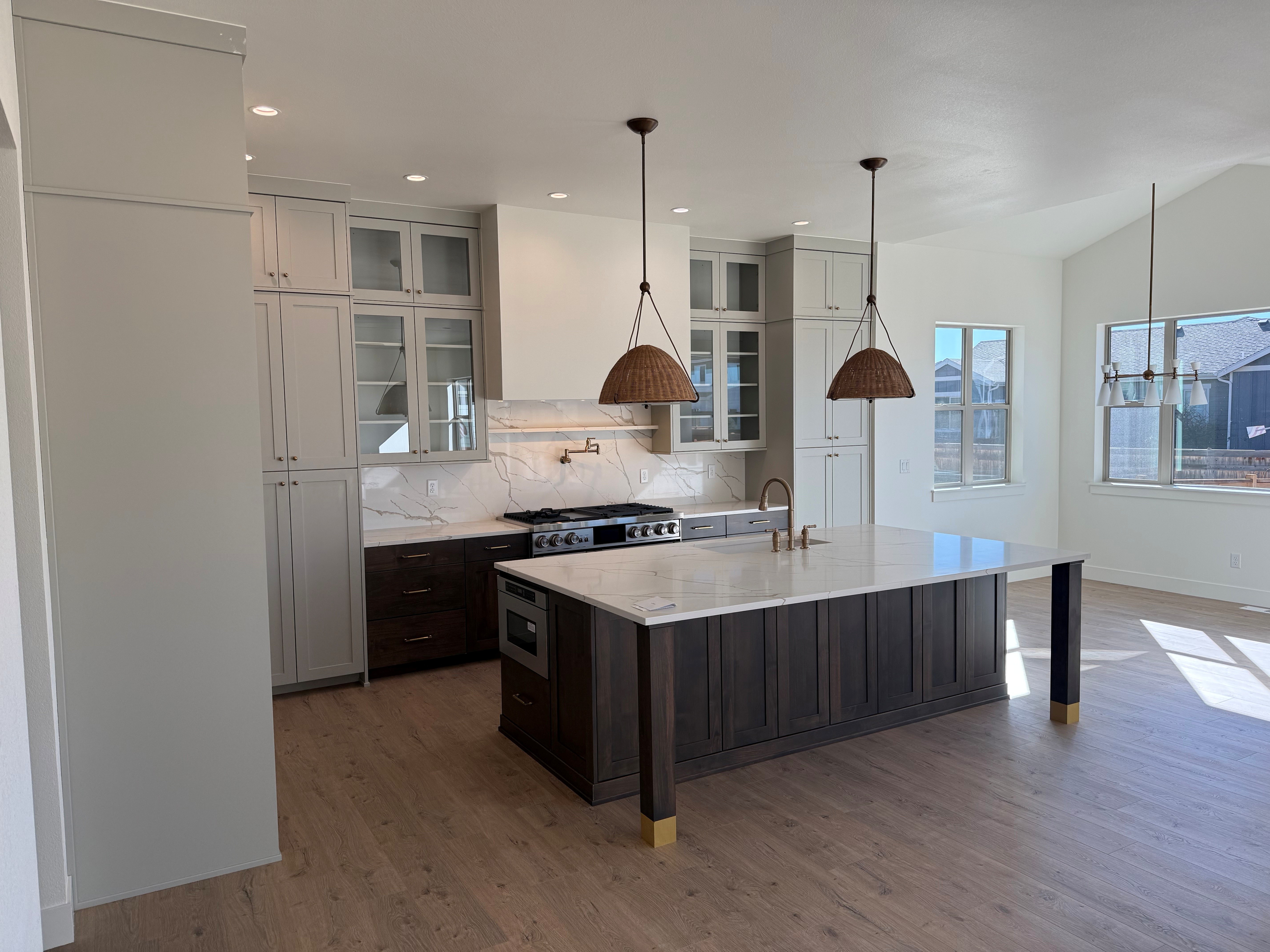 preserve the exact cabinet layout dimensions proportions door styles hardware placement and all architectural features do not change the design geometry colors materials or lighting direction only enhance clarity edges smoothness shadows and subtle realism while keeping the original look completely unchanged add barstools at the island stage the countertop add a dining table by the windows do not change anything else