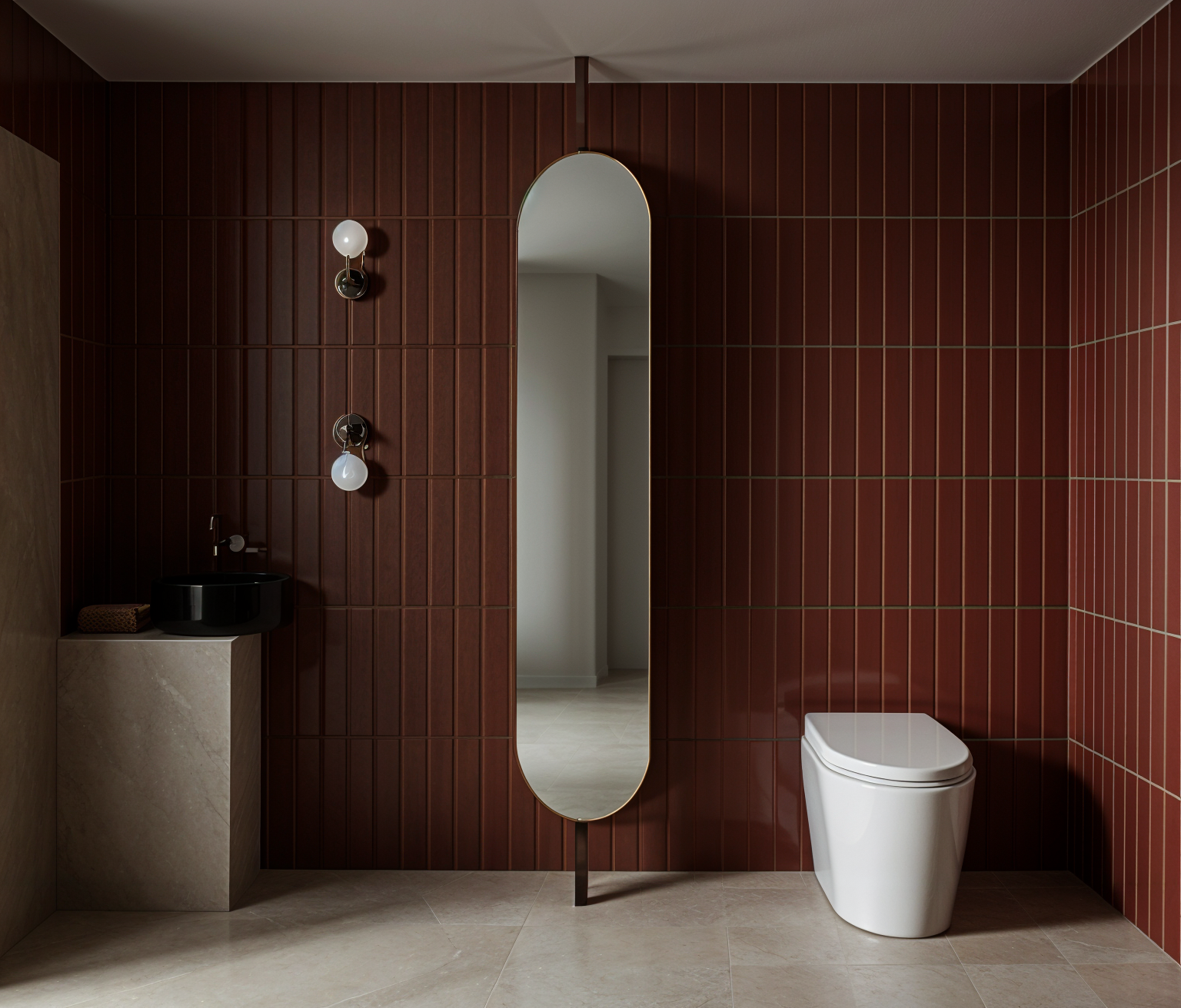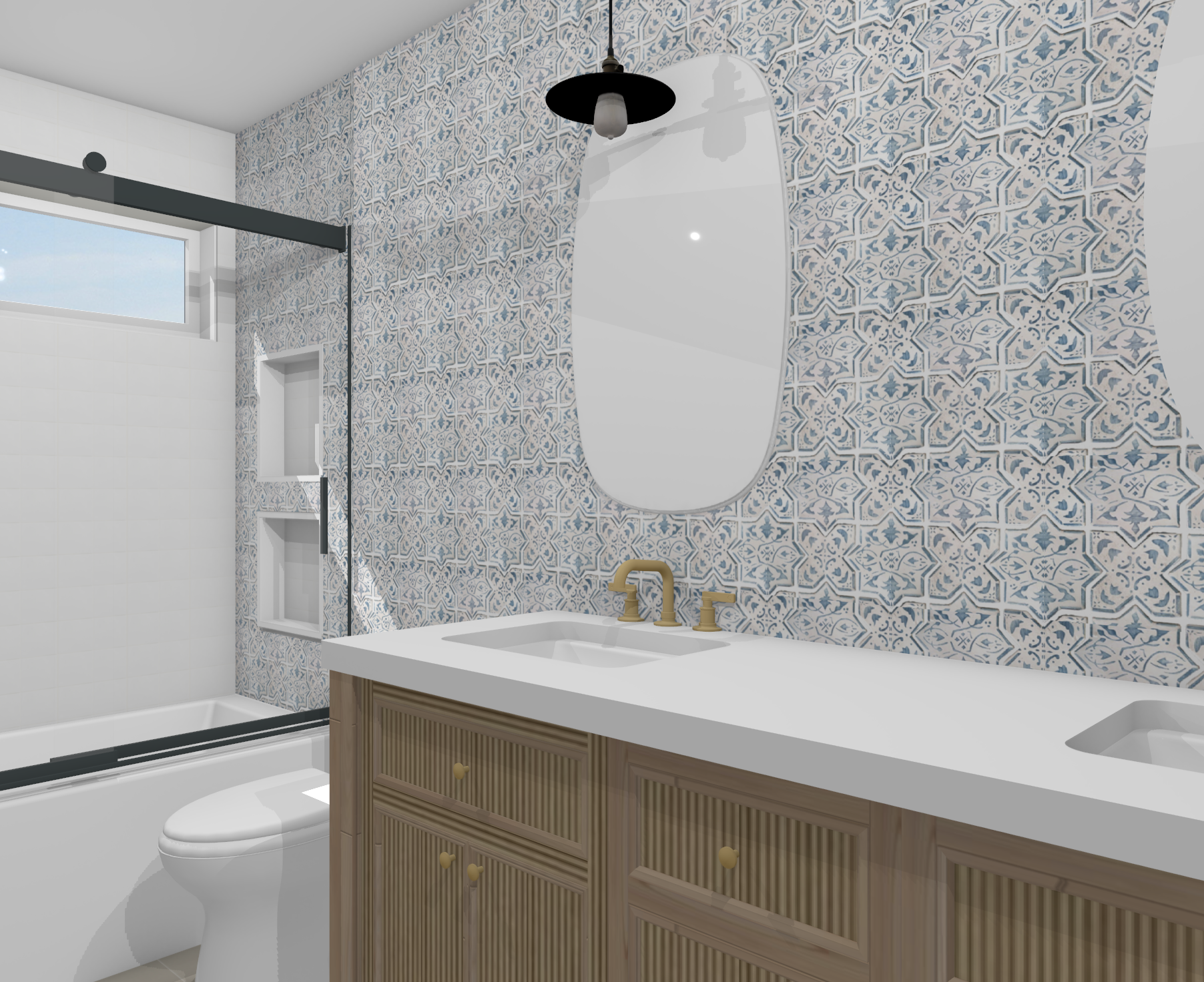 create a photorealistic rendering with warm lighting in this bathroom