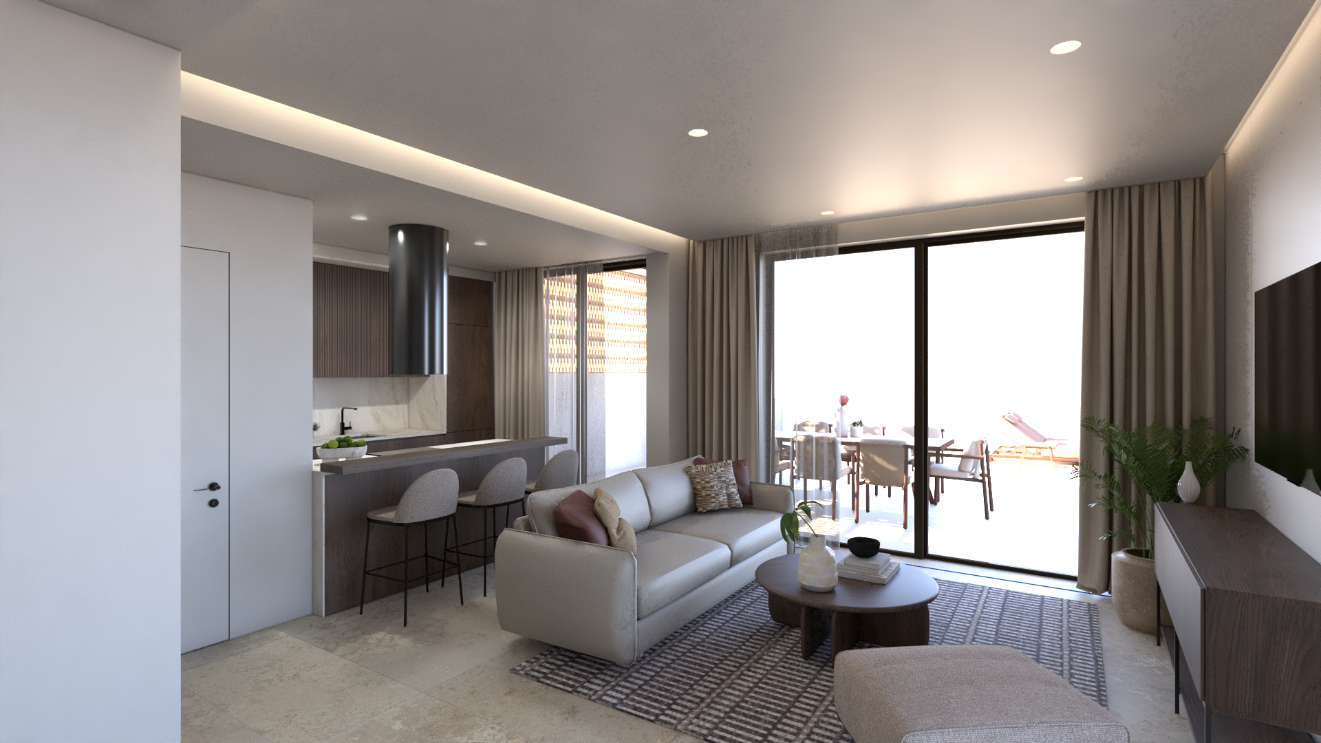a hyper realistic image of a living room interior you can see the sea outside beyond the veranda warm afternoon light