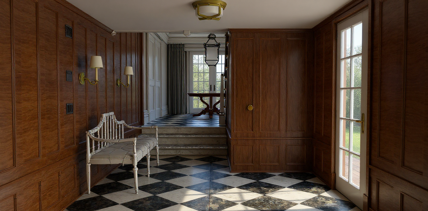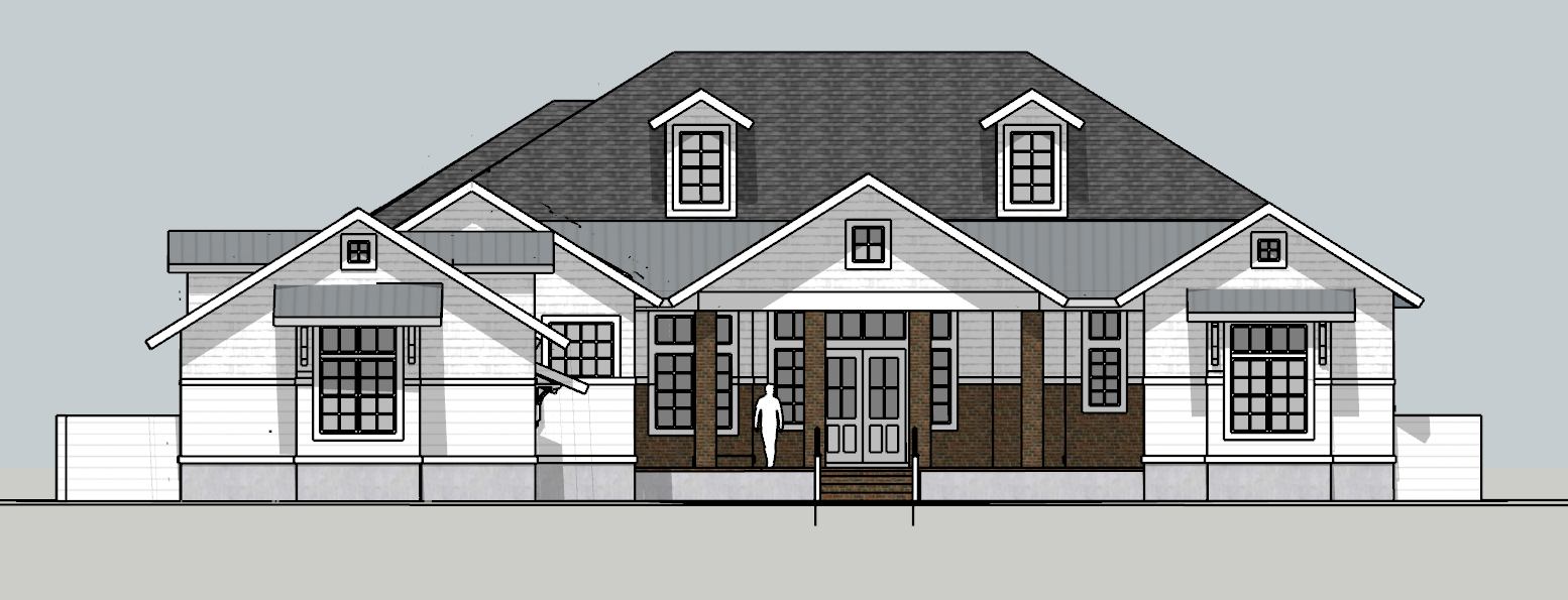 south carolina coastal home blue sky and clouds mid afternoon day show appropriate coastal landscape and trees stucco foundation white horizontal siding white shakes white trim and windows brick columns and brick partial height on porch wall charcoal high definition roof shingles weathered galvalume standing seam roof brick steps