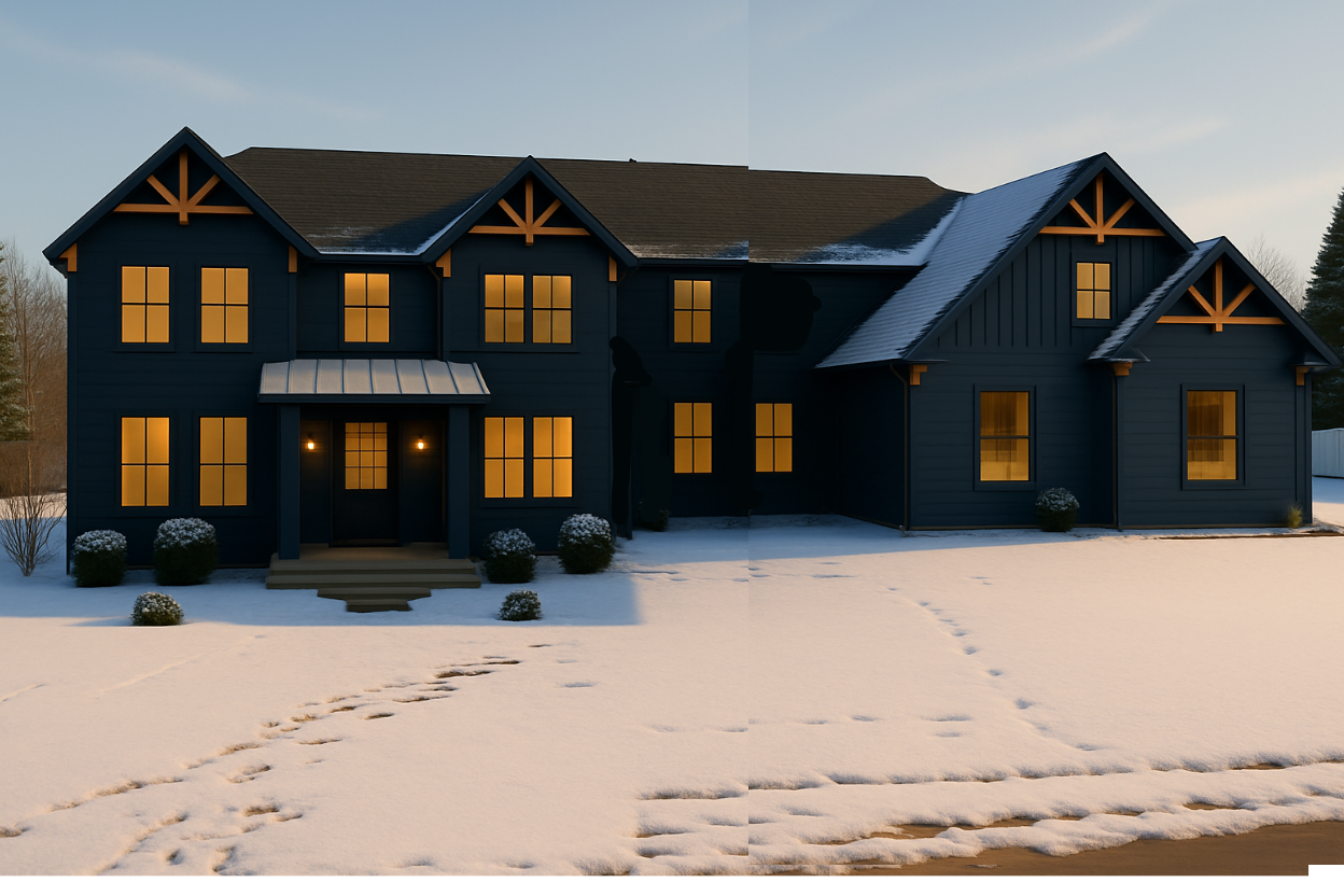 exterior shot dark blue horizontal siding with vertical siding on the peaks and the section to the left and front of the main entrance the left side of the house will stick out further than the garage to the right main entrance door to be a double door appear in the daytime so the house is more visible