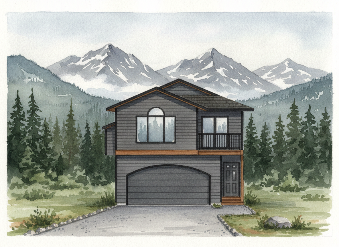 watercolor render of modern farmhouse style home with light paint and dark trim include trees and an alaska like environment in the background simple driveway and walkways in front of the home