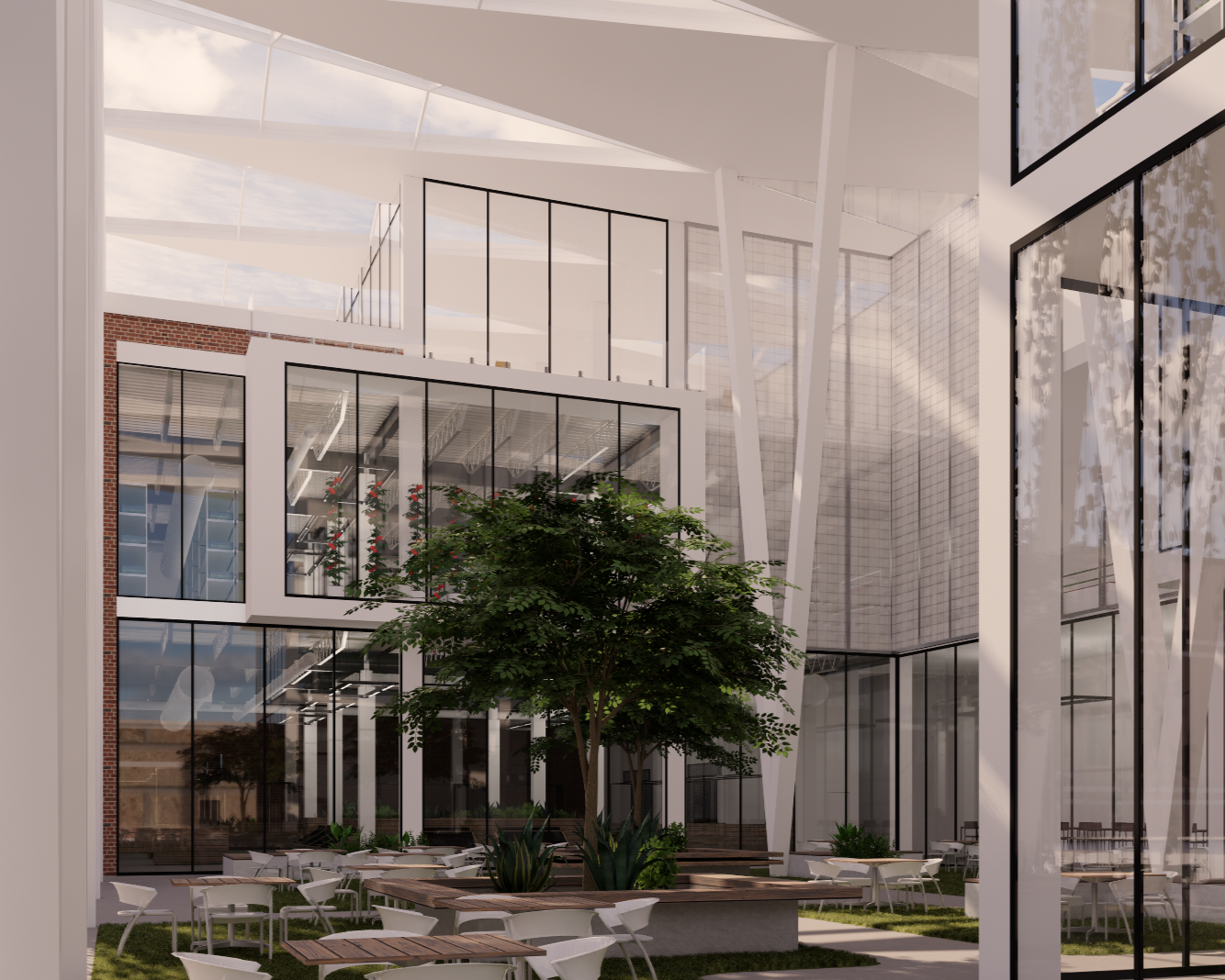 do not change any architecture or geometry keep the roof skylight fabric exactly as it is and only on the roof keep the kalwall only on the vertical wall with its correct grid panel pattern do not mix or blend skylight material with kalwall make the kalwall softly translucent and evenly lit without glowing like the roof improve realism of all materials and lighting but preserve the exact material locations