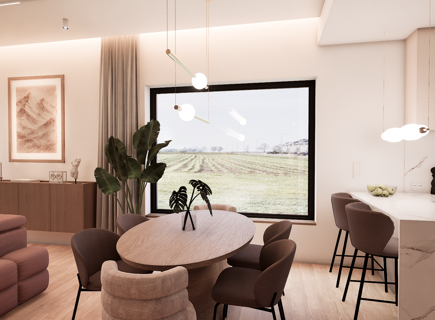 enhance this image to a highly photorealistic standard only by improving lighting quality light balance shadows reflections and overall texture material realism increase the realism and resolution of all existing surfaces and textures while preserving their exact original appearance improve sharpness depth and natural color grading subtly strictly do not change anything else do not alter composition layout camera angle proportions dimensions geometry furniture objects decor colors materials structure styling or placement of any element do not remove add redesign restyle replace or invent anything do not modify shapes or sizes the final result must be the exact same image only with significantly better lighting realism and higher quality textures material definition zostaw drewniany st tekstura jaka jest ale popraw tylko tekstur szk a z wazonu