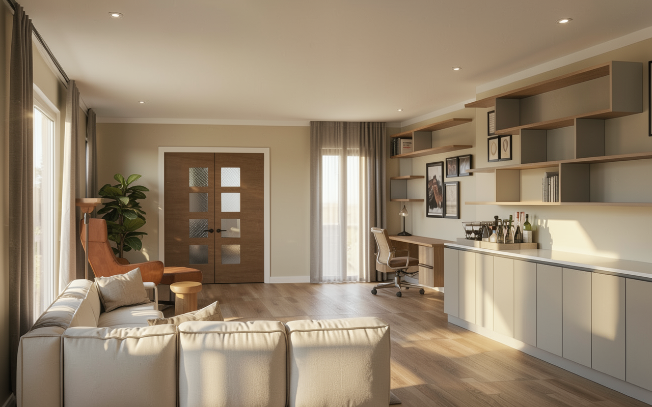 use the uploaded moodboard as design reference only to create one cohesive interior space visual do not blend collage or overlay the moodboard images together instead interpret the images and translate the materials colours textures furniture style and overall atmosphere into a single realistic interior scene the output should look like a photorealistic architectural render of a real space not a moodboard maintain the same design language palette and material qualities seen in the references but apply them naturally within one room layout focus on spatial composition realistic scale and coherent interior design lighting should be soft and natural enhancing the materials and atmosphere avoid duplicating the reference images text or graphic layout from the moodboard output must be one interior perspective of a designed space inspired by the moodboard not a compilation of reference images it s a bathroom