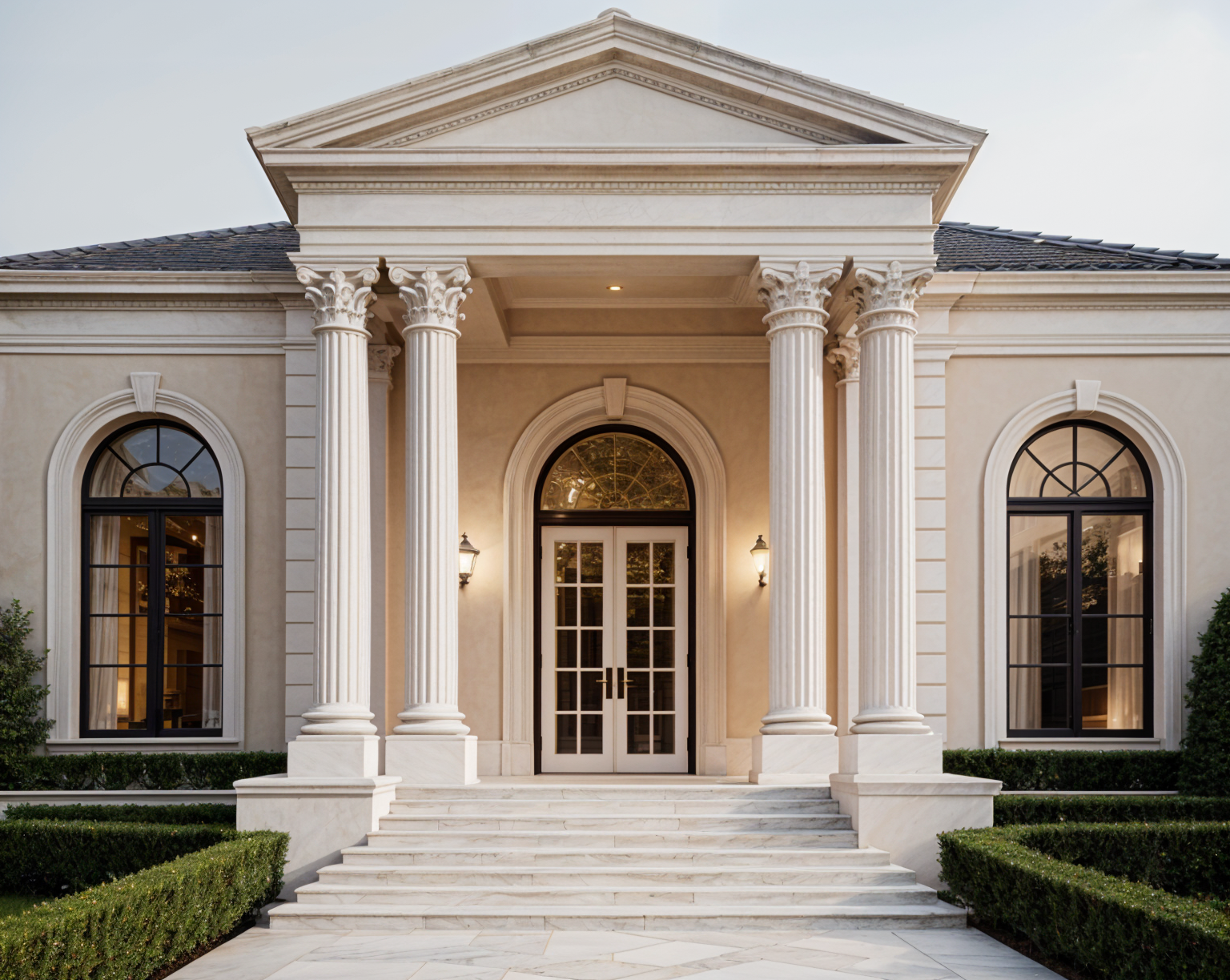 luxury modern villa with clean rectangular geometry double height arched glass panels white stone cladding shaded terrace with pergola frontal water feature tropical landscaping with palm trees contemporary middle eastern influence