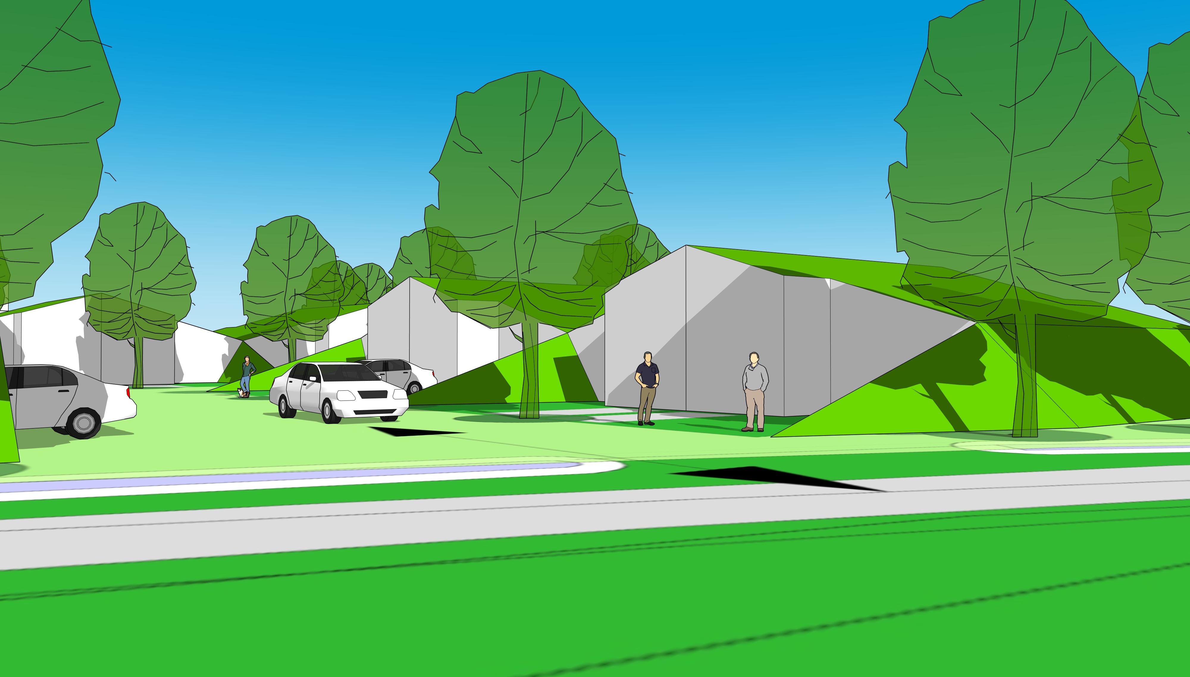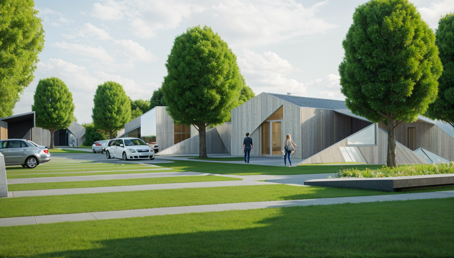 sustainable design exterior shot this is a modern ecological housing project with much nature inclusivity modern attached houses with sloping green roofs with green grass plants and flowers in a very green setting with lots of trees architecture