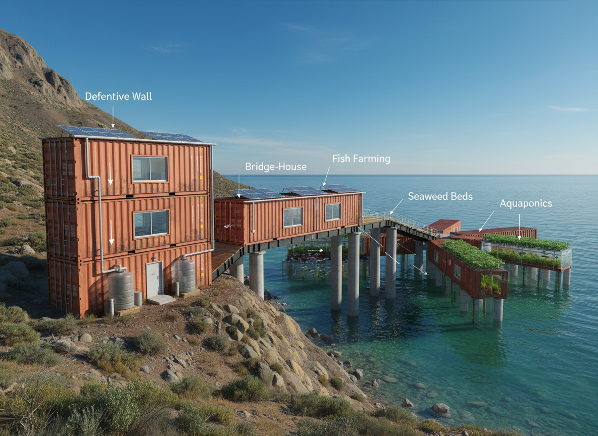top down site plan of a survival settlement using shipping containers located on a mountain slope leading into the sea left side land zone two side by side containers with one on top in the middle forming a defensive wall with a central door all containers to be in white colour middle bridge house one long container elevated above ground water connected to the top defensive container in the middle of the land gate to the floating platforms right side sea zone three container prongs extending outward like a trident into the sea see image prong 1 fish farming cages rectangular netted enclosures drawn below waterline prong 2 half submerged seaweed cultivation racks prong 3 aquaponics tanks with crops and fish style architectural site plan clean linework minimal color palette water in blue land in brown green containers in rust orange