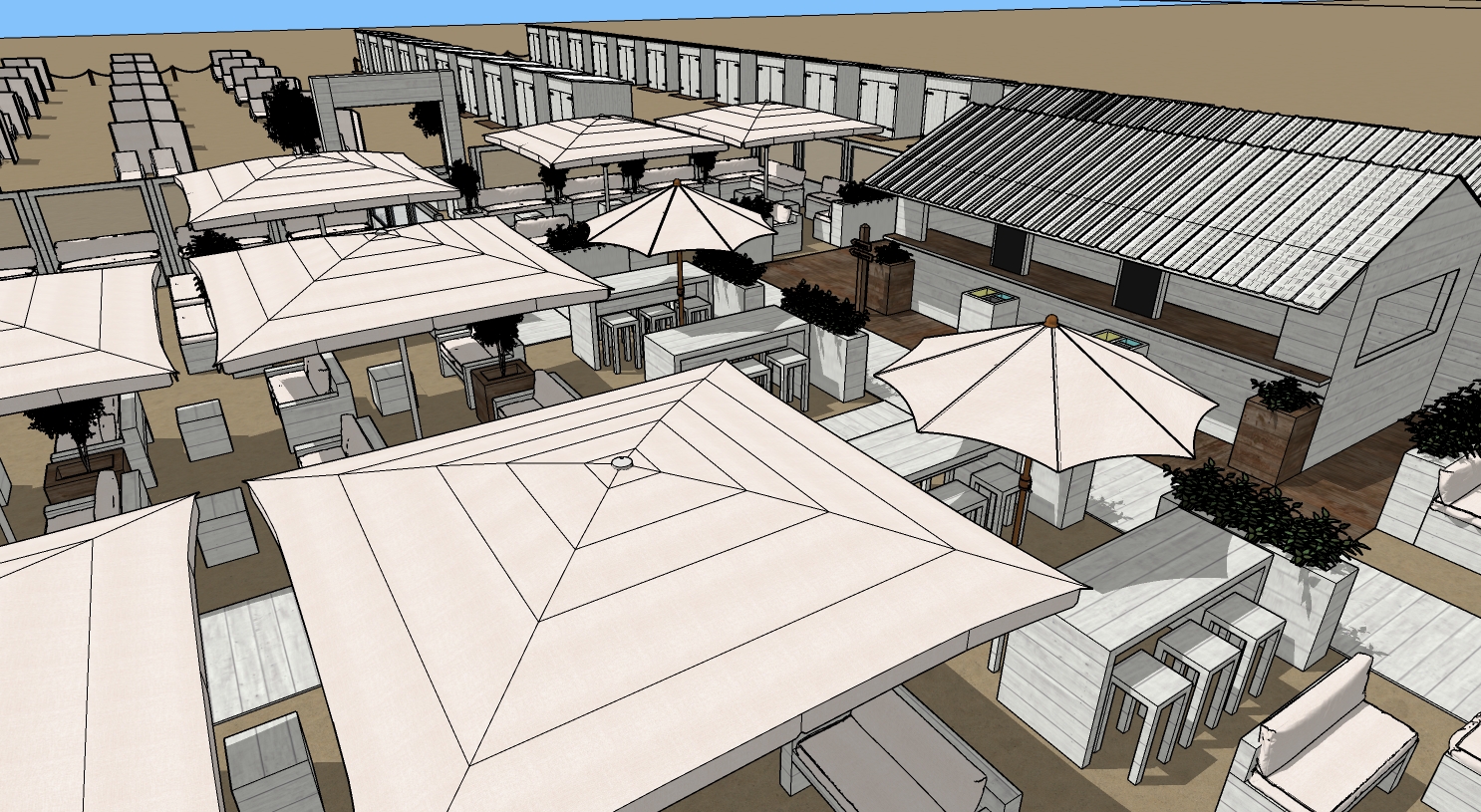 strandbar alles in wit geschilderde planken voeg veel mensen in strandkleding toe alsook zeer veel kinderen graag de bar inkleden met personeel er achter die aan het werk is cocktail menu op zwarte boarden fotorealistisch