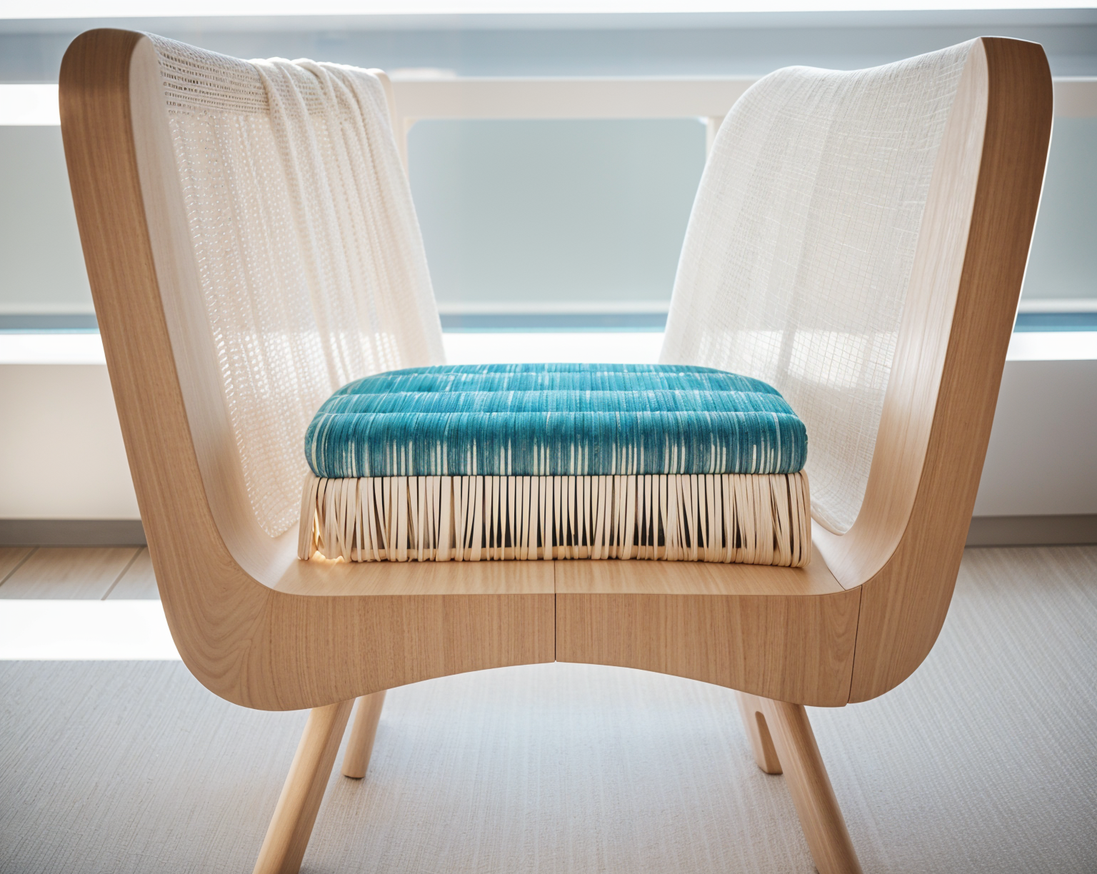 modernist perspective shot sea grass weaving inspired chair back accent upholstered seat wooden legs wire brush finish architecture