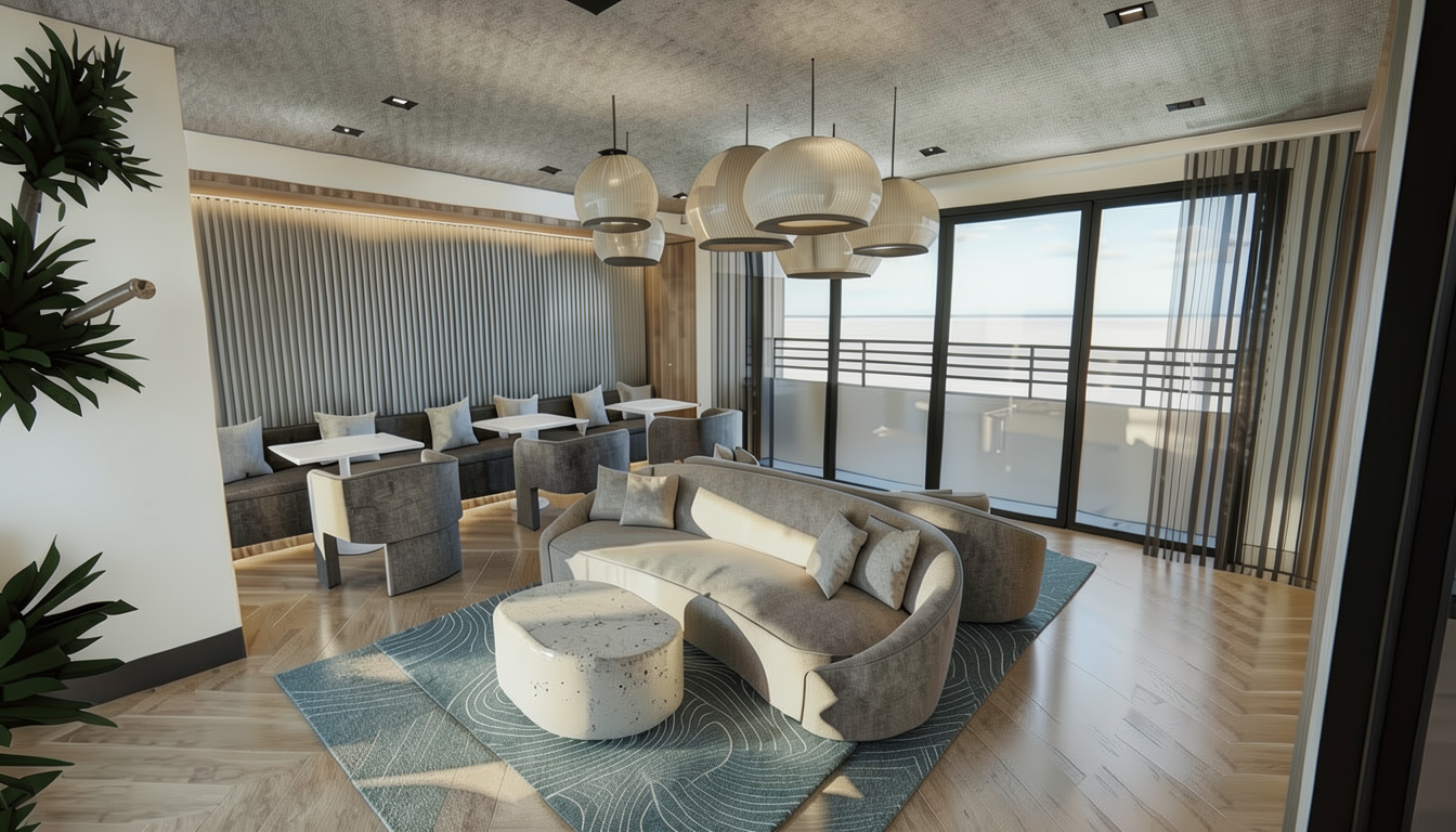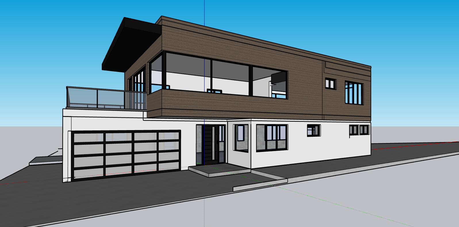 please render this 3d screenshot location malibu you should see the malibu hills in the background first floor is gray plaster and second floor is horizontal walnut paneling about 6 wide panels the overhang on the the second floor above the garage is black metal black windows throughout