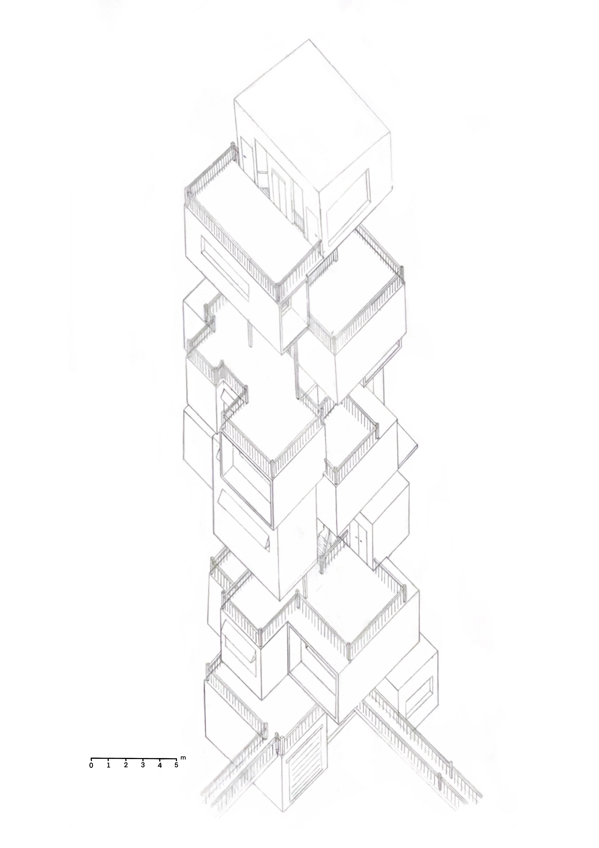 exterior shot timber facade with external steel stair and lift core in the centre placed in an australian forest in a subtropical arid climate