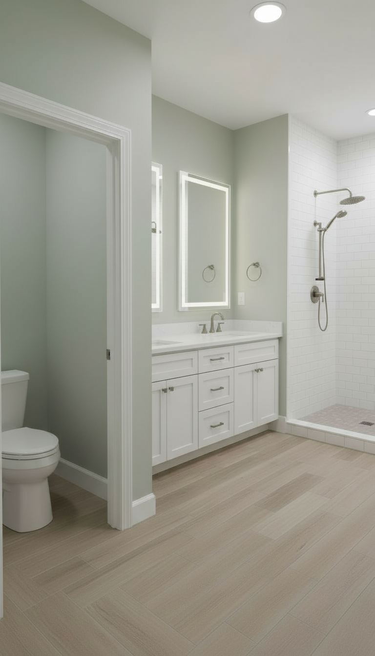 keep layout and color change to single sink vanity add upper cabinets to vanity on side of sink make shower roll in