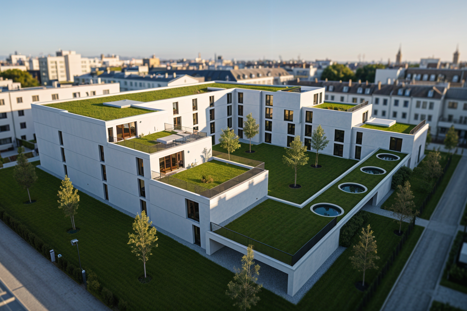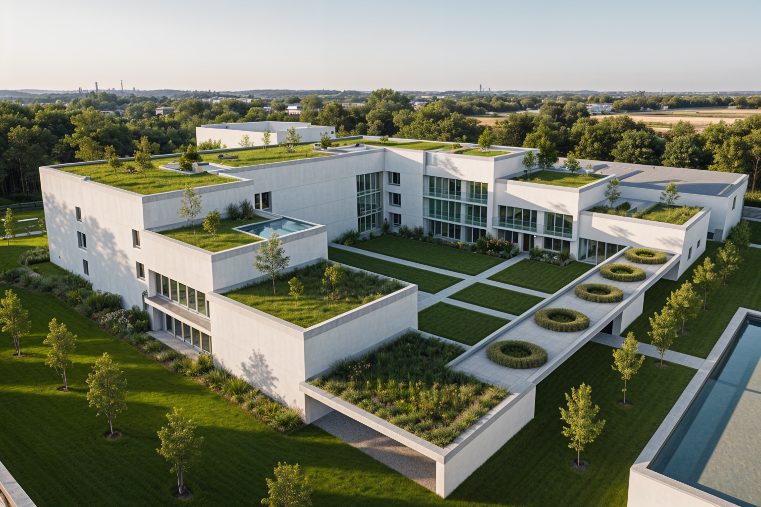 richard rogers aerial shot the modernist white building is surrounded by low greenery lawn and small trees the building s facade is white plaster with balconies and dark balustrades big windows on elevation grass on a roof architecture