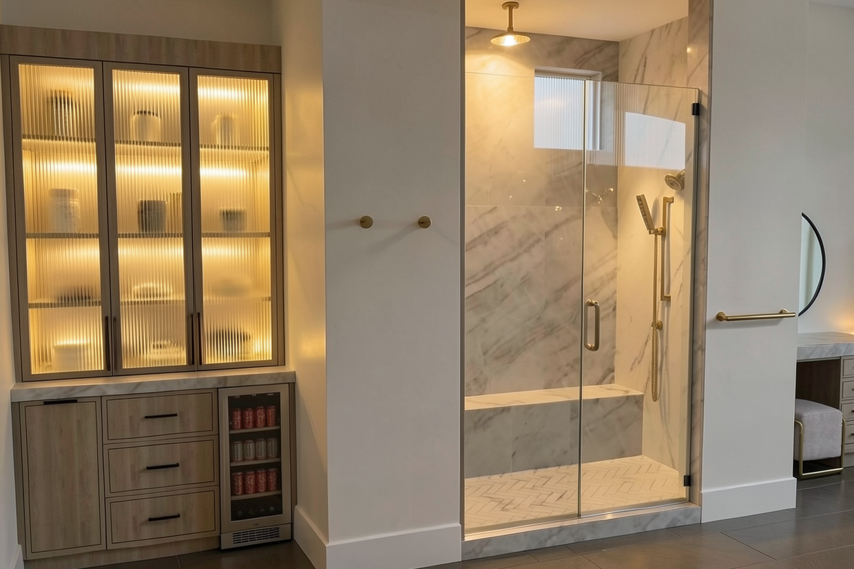 the shower wall with shower head is a textured cream limestone tile 12x24 laid vertically the lights in the cabinet should just give a soft glow coming from the sides