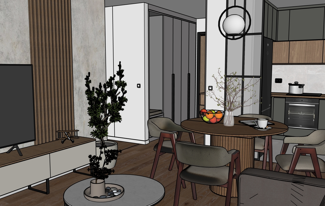 make realistic natural light only from left down corner to hall keep textures colors and materials wood material on chair make same like wood material of table don t change colors and don t add decoration just keep visible in photo wardrobe in the center of the photo keep same as on imported picture and same colors add ambient light and make the best possible realistic