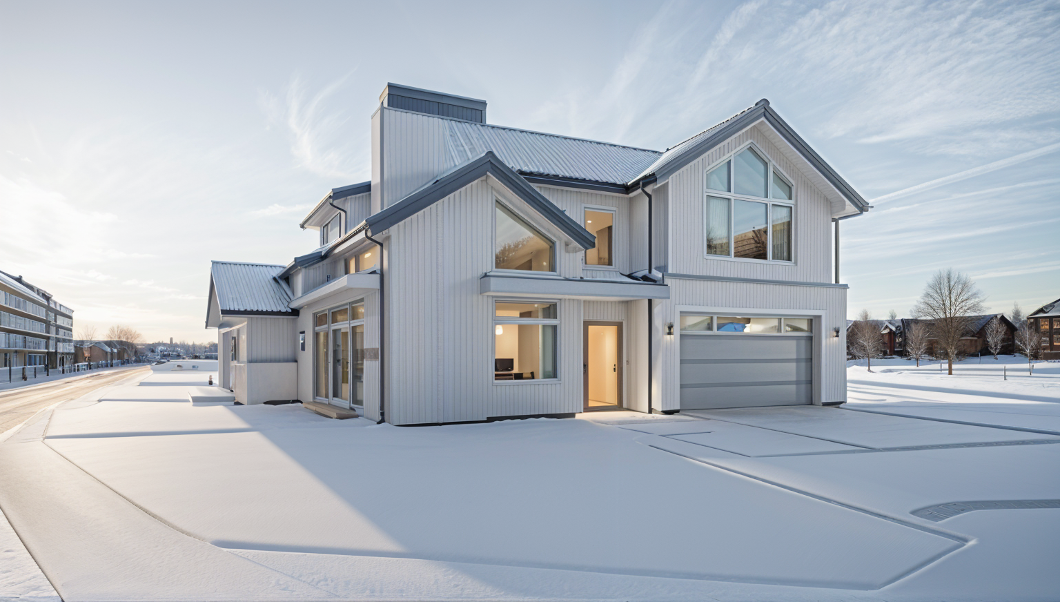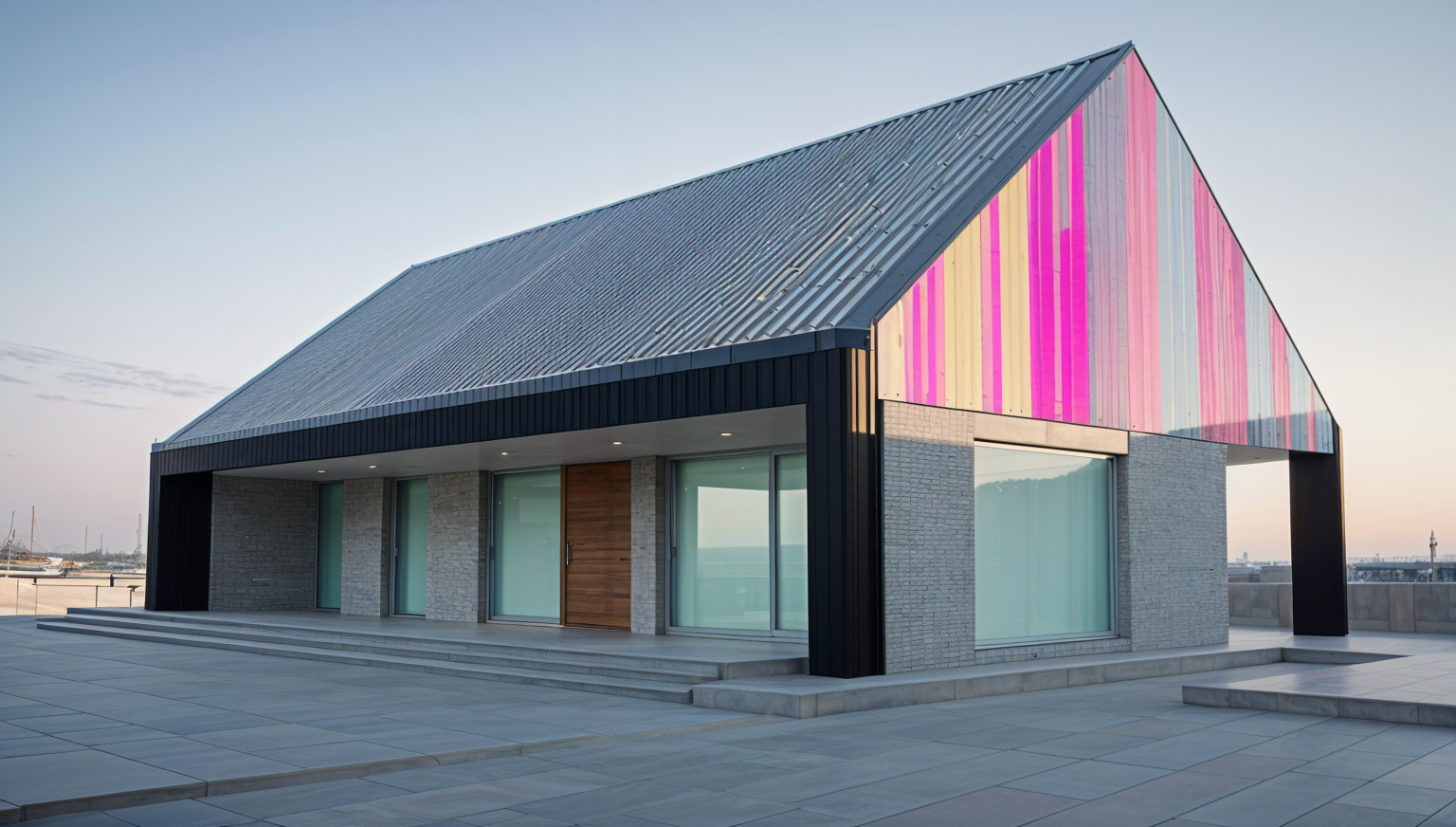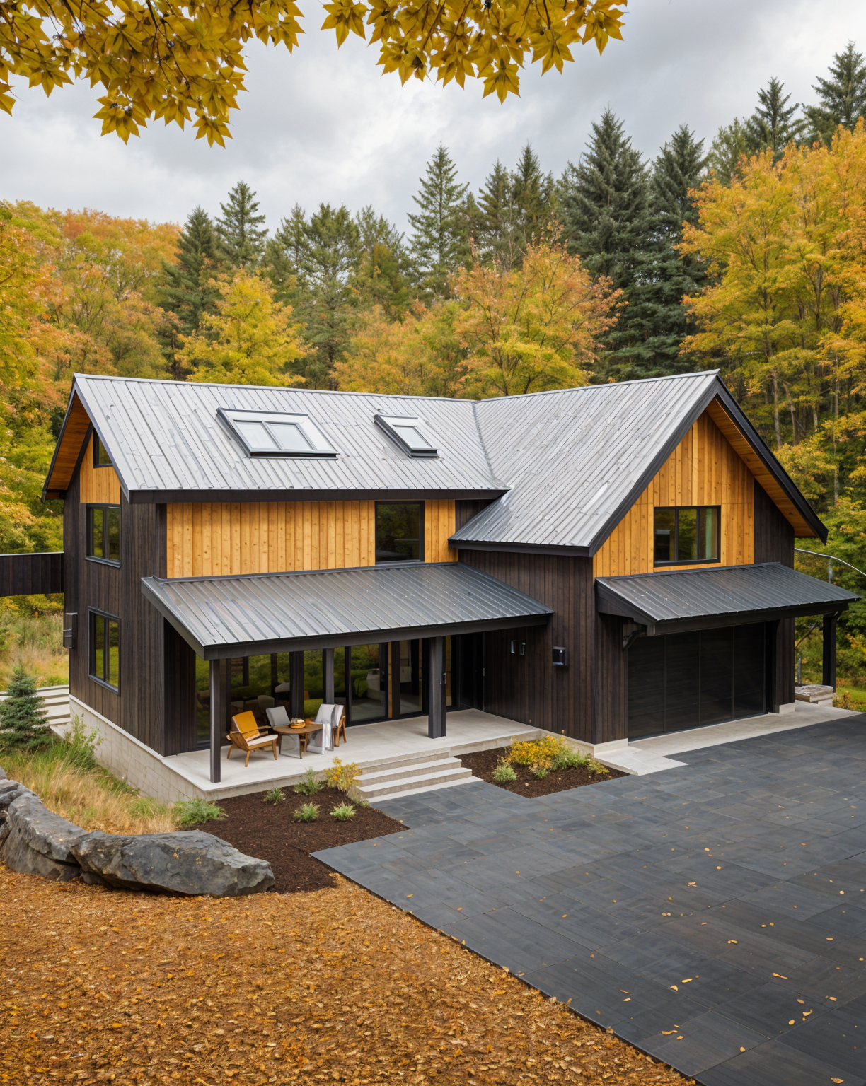 modern exterior shot rustic modern house with sleek dark steel siding and a contrasting silver metal roof bright clear sky above casting soft natural light over the serene scene architecture