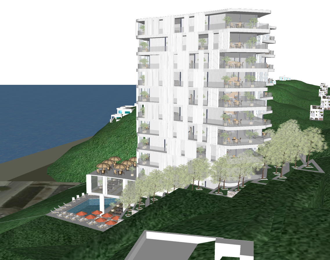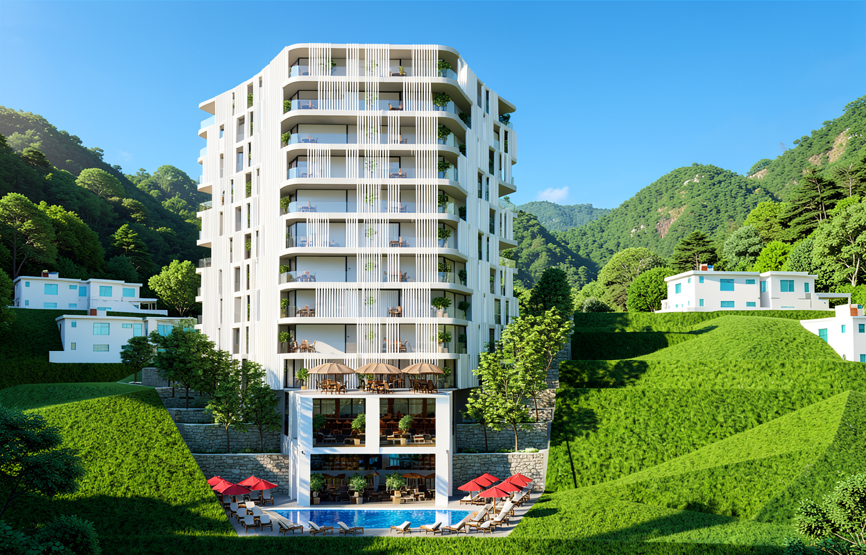 render a modern elegant apartment building nestled in lush green hills the building features sleek white facade elements with vertical accents and soft balconies highlight vibrant green hills surrounding the structure with the hillside setting ensuring a serene and peaceful atmosphere include small residential buildings painted in white and sky blue scattered around adding charm to the scene at the base depict a luxurious pool area with azure water surrounded by chic lounge chairs with rustic red umbrellas establish a clear blue sky as the backdrop to enhance the tranquil and sunny ambiance overlooking the sea