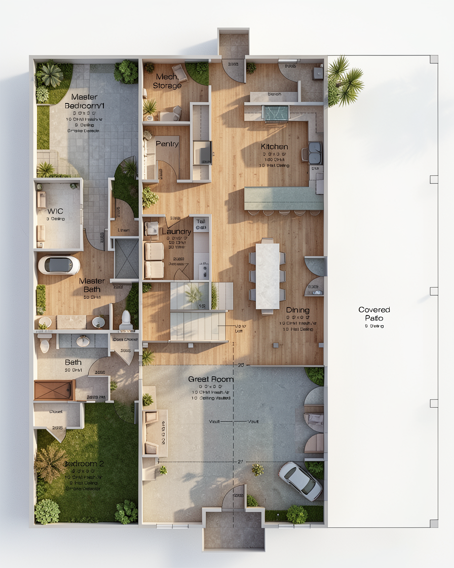 generate a 3d floor plan with 10 walls wood flooring throughout no cars