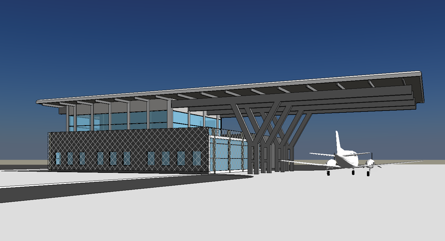 herzog de meuron exterior shot want to add metal perforated screen with large and small cutouts around curtain wall which allows light from the interior to glow from the inside to the outside architecture make metal panel 30 percent perforated with pattern make background typical south texas airfield background with no trees foreground all pavement add rooms to second floor outside cafe on open air balconey